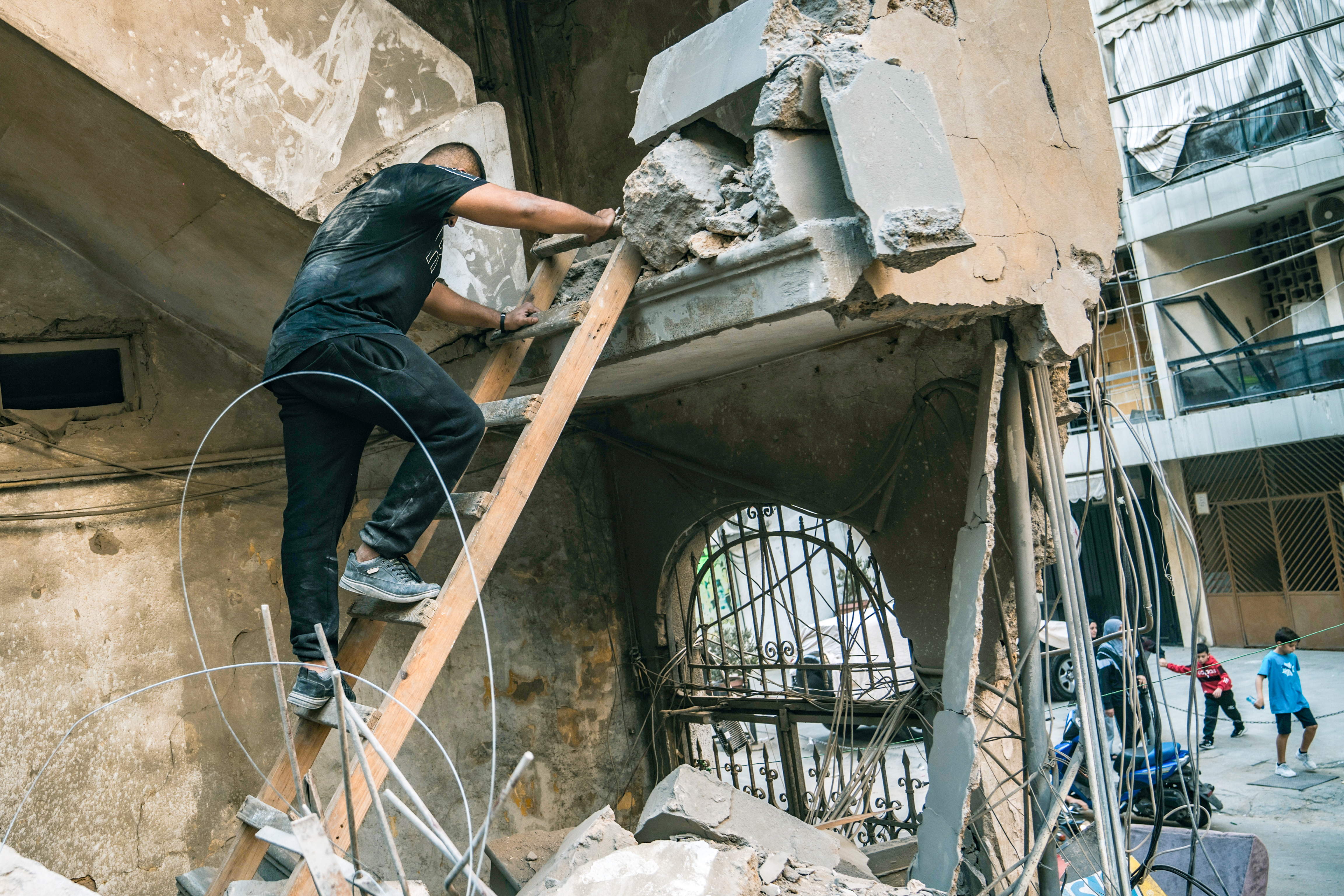People on the street helped the family down. Today, a ladder stands propped up on a pile of rubble on the ground floor for people to use to get up to the first floor.