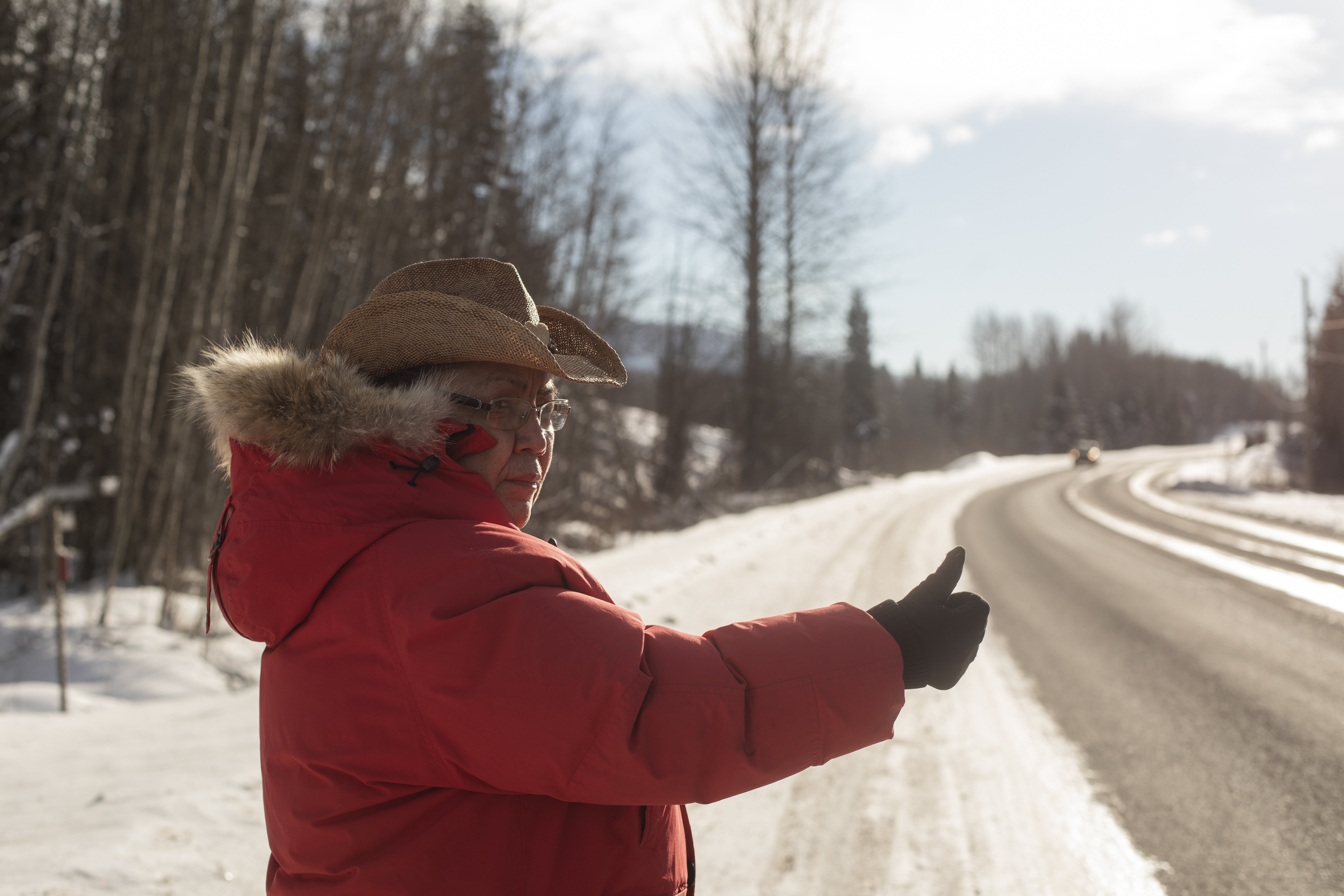 It is easy to hitch a ride, Marian says. To prove her point, she walks over to the shoulder of Highway 16 and sticks out her thumb. It is a bleak, haunting place, surrounded by wilderness. Every few minutes, a truck or passenger vehicle passes by. Within five minutes, a grey-haired white man in a farm truck has stopped to offer her a ride. When she explains that she doesn’t actually need one, the man shakes his head, hits the gas hard and drives off. “It’s that easy,” she says with a shrug.