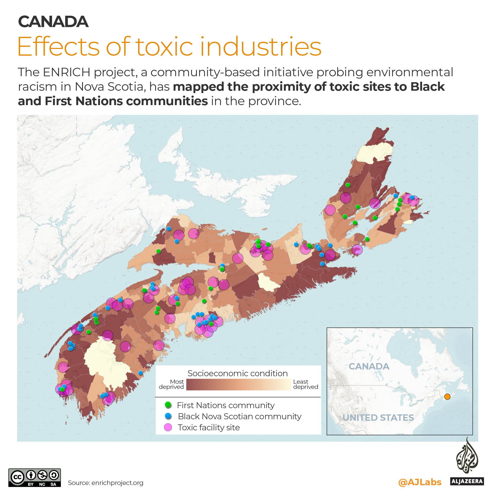 At the same time, Waldron and Naolo Charles, who co-founded the Canadian Coalition for Environmental and Climate Justice, are looking to expand upon the work of ENRICH by developing a Canada-wide map of environmental racism hotspots. “There’s a lack of data, first of all, because in Canada we typically don’t really collect race-based data ... [and] when you don’t have the data, then it’s really hard for you to actually engage people and tell them, ‘this is the issue’,” Charles tells Al Jazeera.