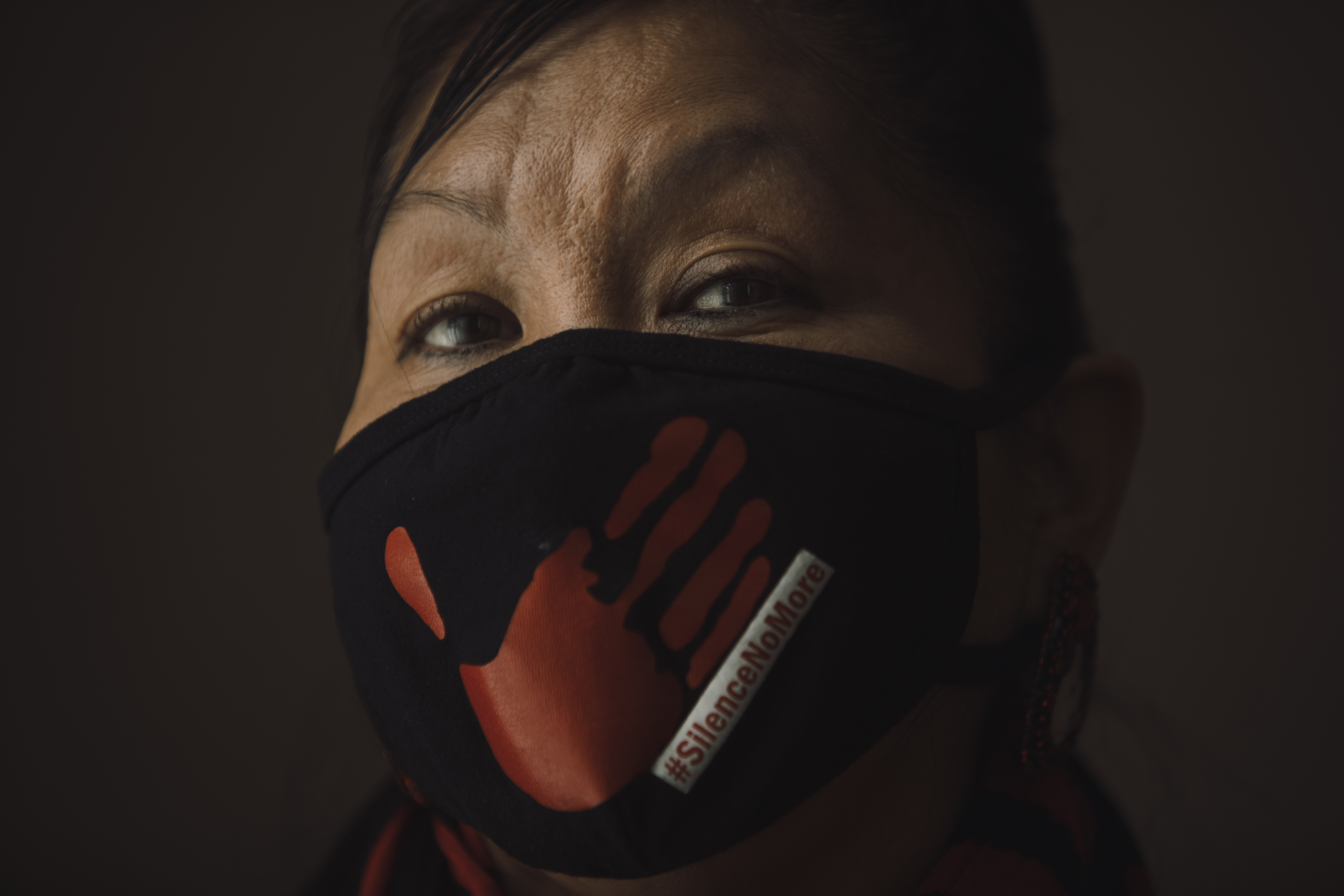 Brenda is dressed from head to toe in red, a colour that represents MMIWG, and wears a black mask with a red handprint. She has brought several framed photos of her sister to the local hotel where we are meeting. They show a fair-skinned young girl with dark, almond-shaped eyes, high cheekbones and long black hair.