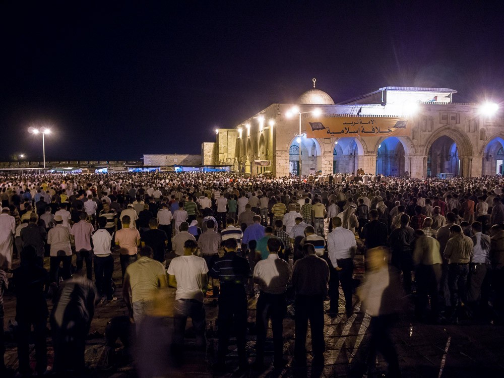 Muslim worshippers pray in front of the Al Aqsa Mosque on the night of Laylat al-Qadr.