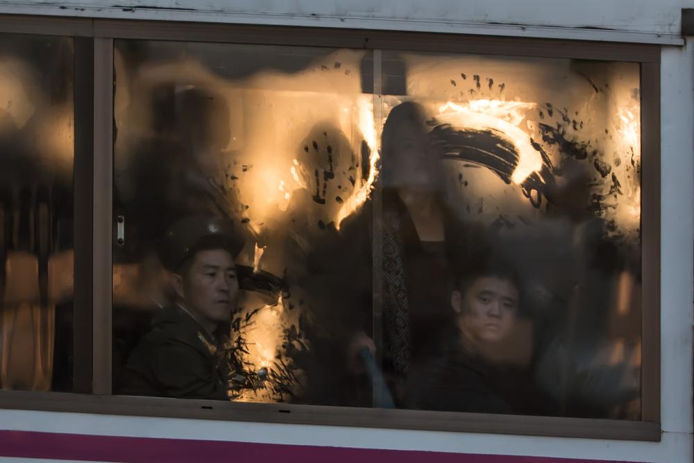 Buses are the mass transport of choice in this part of Pyongyang; old rusted ones from the 1960s share the road with brand new vehicles. Inside, silent passengers look out through mist-covered windows.