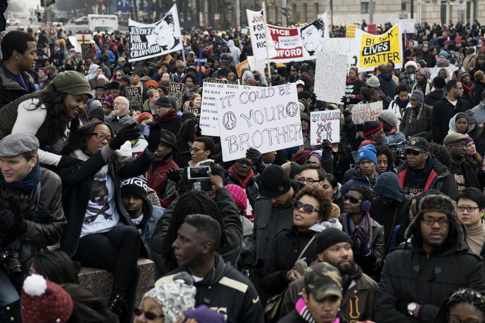 Leading the rally were the families of Eric Garner, John Crawford III, Tamar Rice, Michael Brown and Amadou Diallo. The sea of demonstrators carried signs bearing the names of victims of police violence, and slogans such as “It could be your brother,” and “No justice, no peace.”