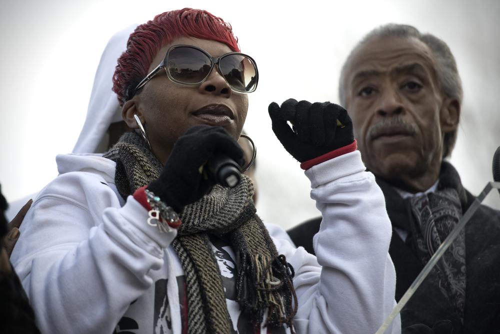 Parents and spouses of the slain men thanked the protesters for their ongoing support and called for continued demonstrations in response to the recent grand jury decisions not to indict the police officers involved in the deaths.