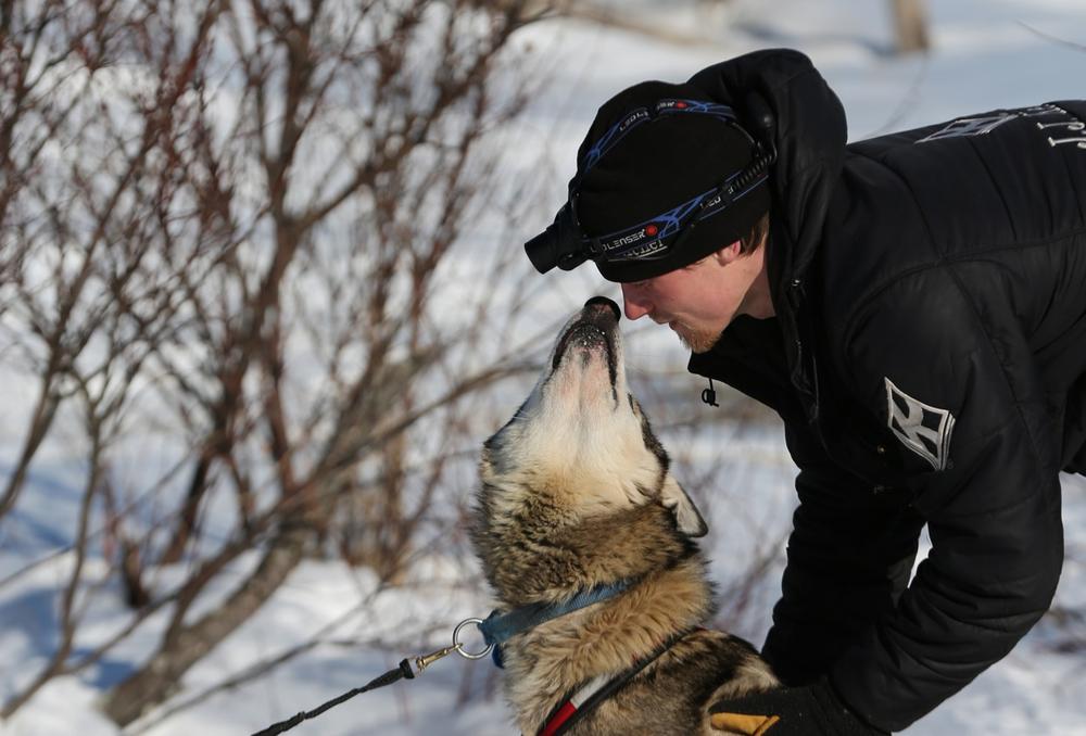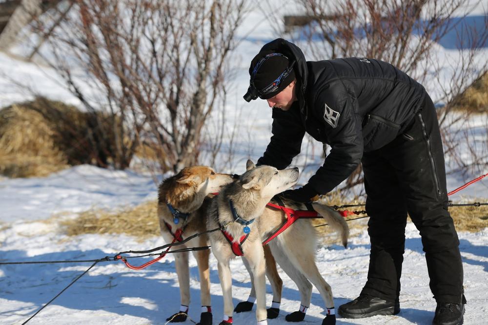 Dallas Seavey, who won this year(***)s race, pets his dog team at the Kaltag checkpoint.