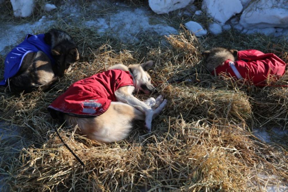 The dogs take a well-deserved rest on straw beds in the snow.