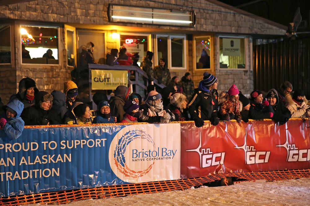 A crowd gathers at the village of Unalakleet, one of the 26 checkpoints on the route.