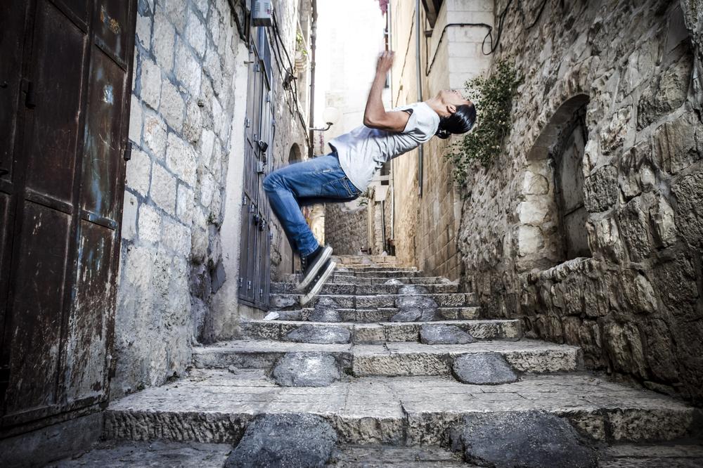 Jerusalem – Walking down the narrow streets of the Old City of Jerusalem, silhouettes of young men fly over market stalls in the souk. These daredevils are Palestinians practicing parkour, the death-defying sport combining gymnastics, acrobatics, running and jumping.