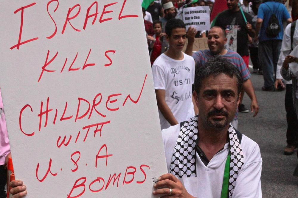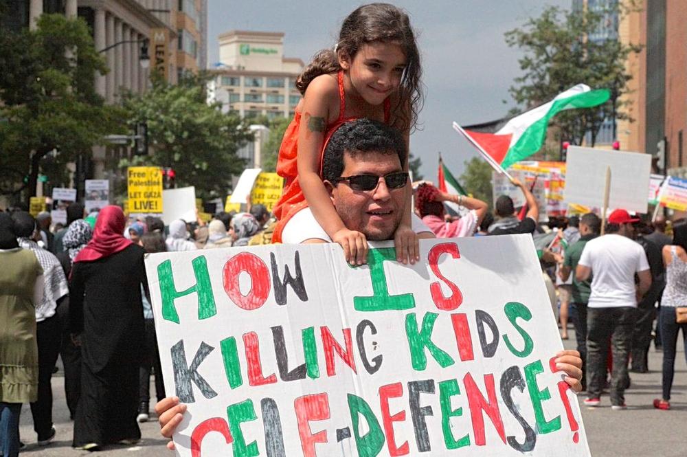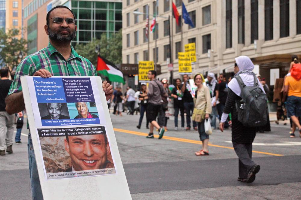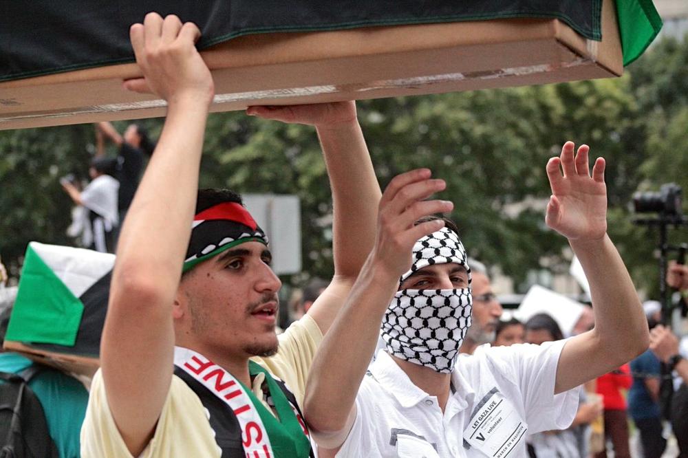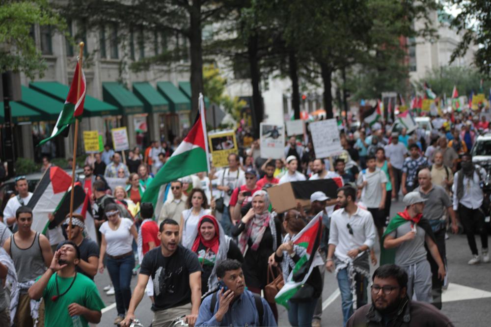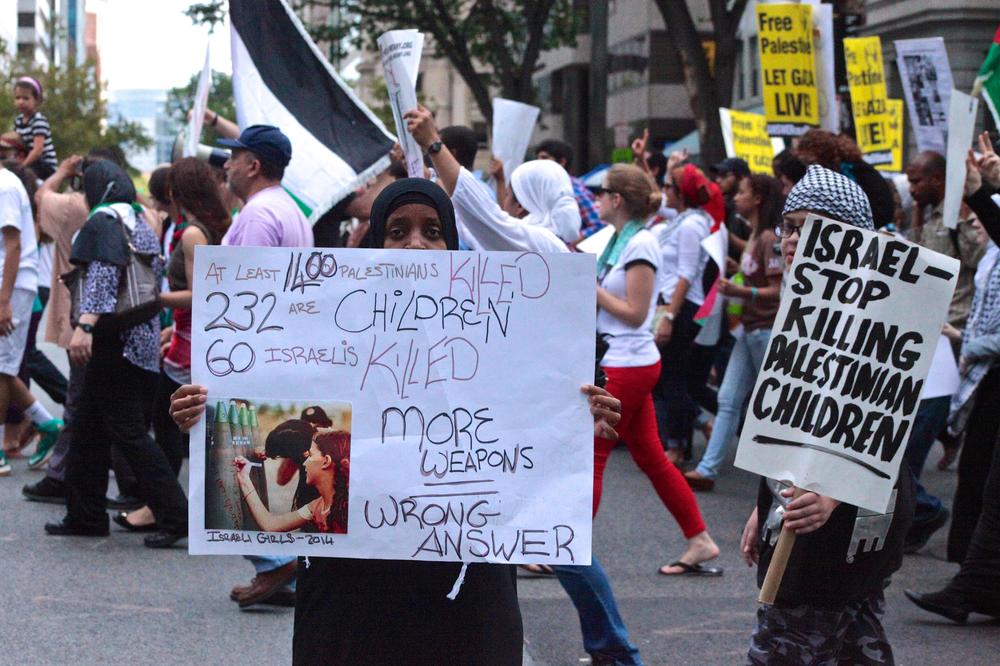 Demonstrators carried symbolic coffins draped in the Palestinian flag to represent the nearly 1,700 Palestinians killed by the Israeli bombardment, many of them women and children. More than 8,500 have been injured since the offensive began July 8. The protesters chanted slogans like, “Free, free Palestine, killing children is a crime,” and “Five, six, seven eight, Israel is an apartheid state.”