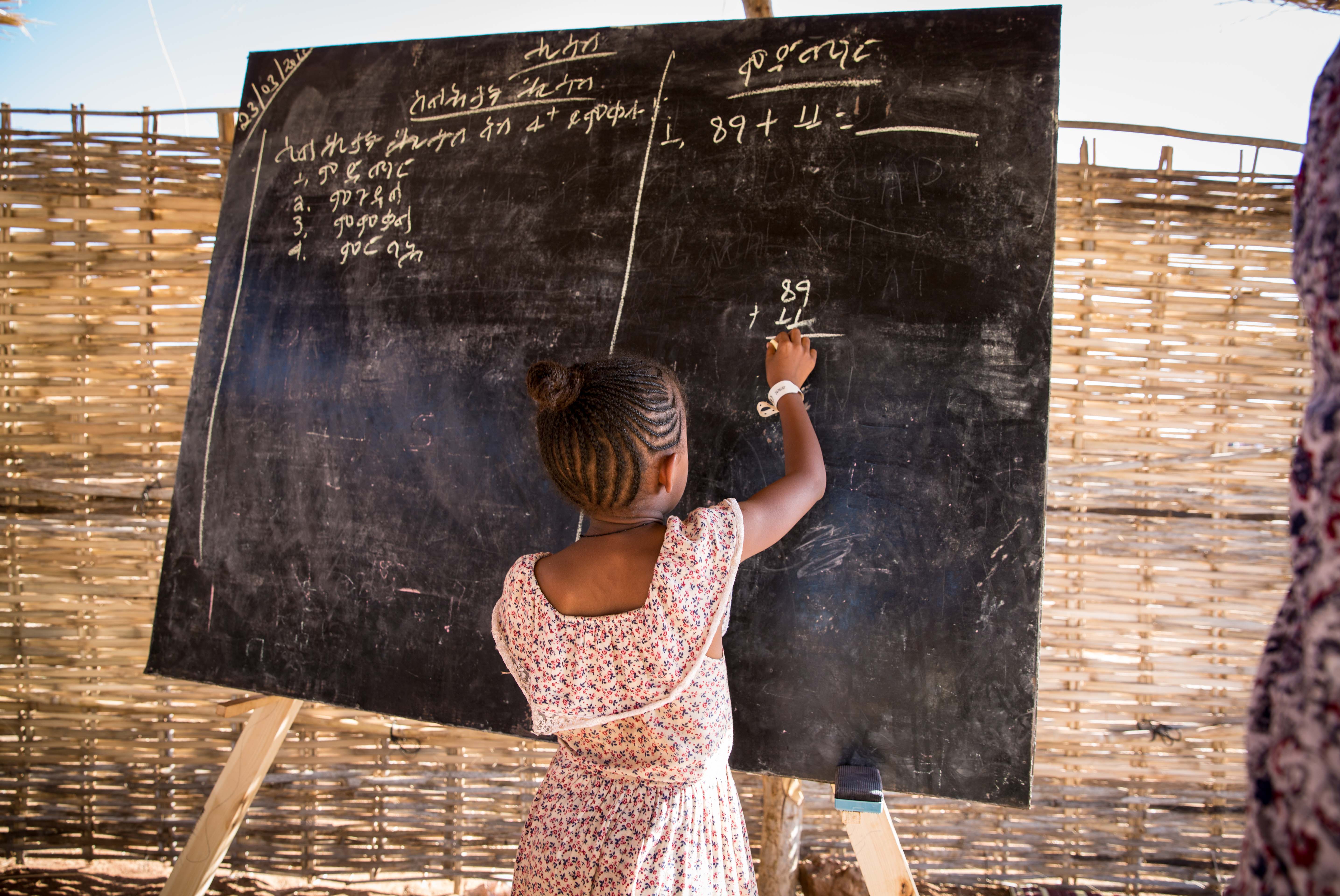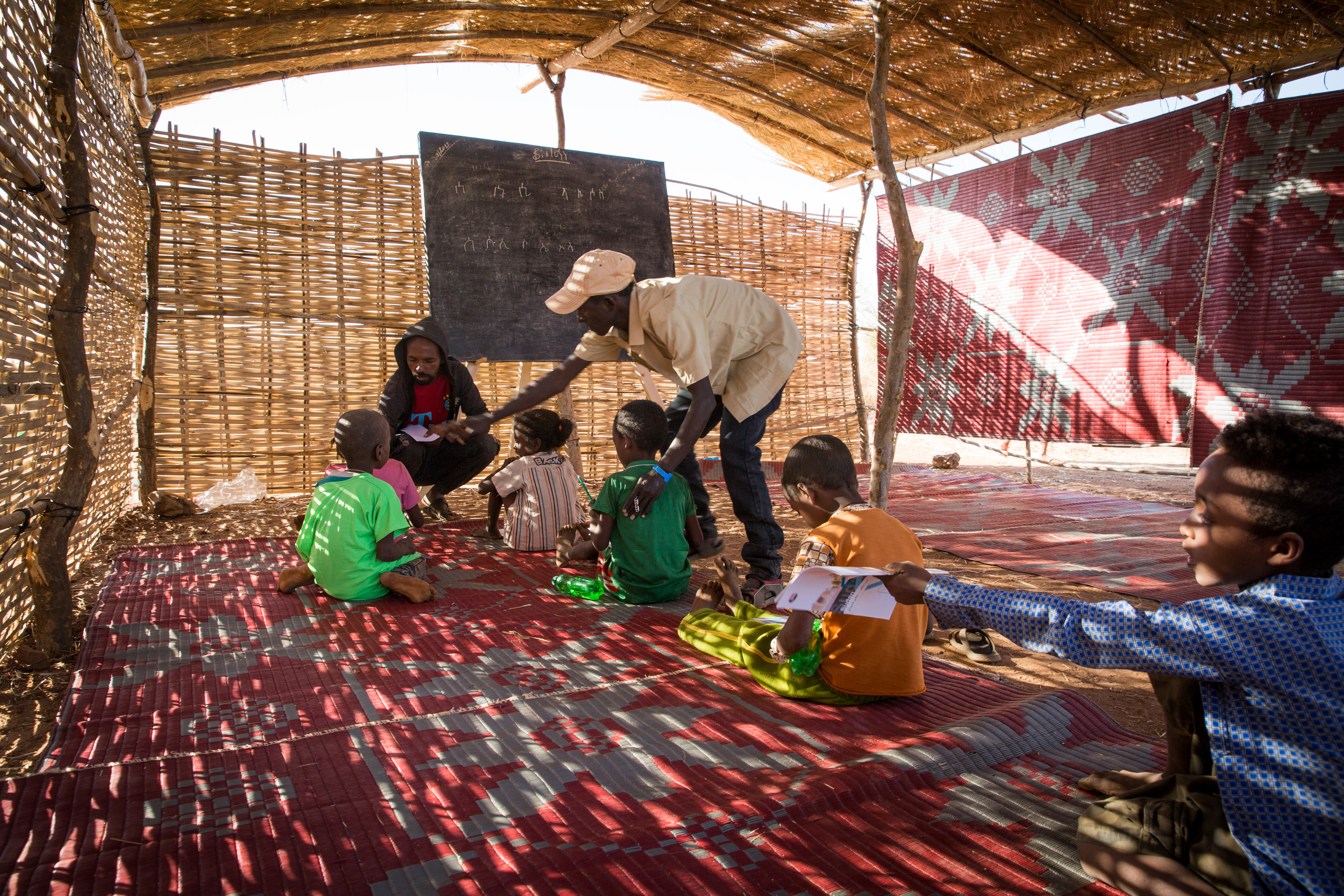 Refugee teachers start lessons with songs under wooden shelters – the sound of children singing is a welcome distraction for those missing family members back home.