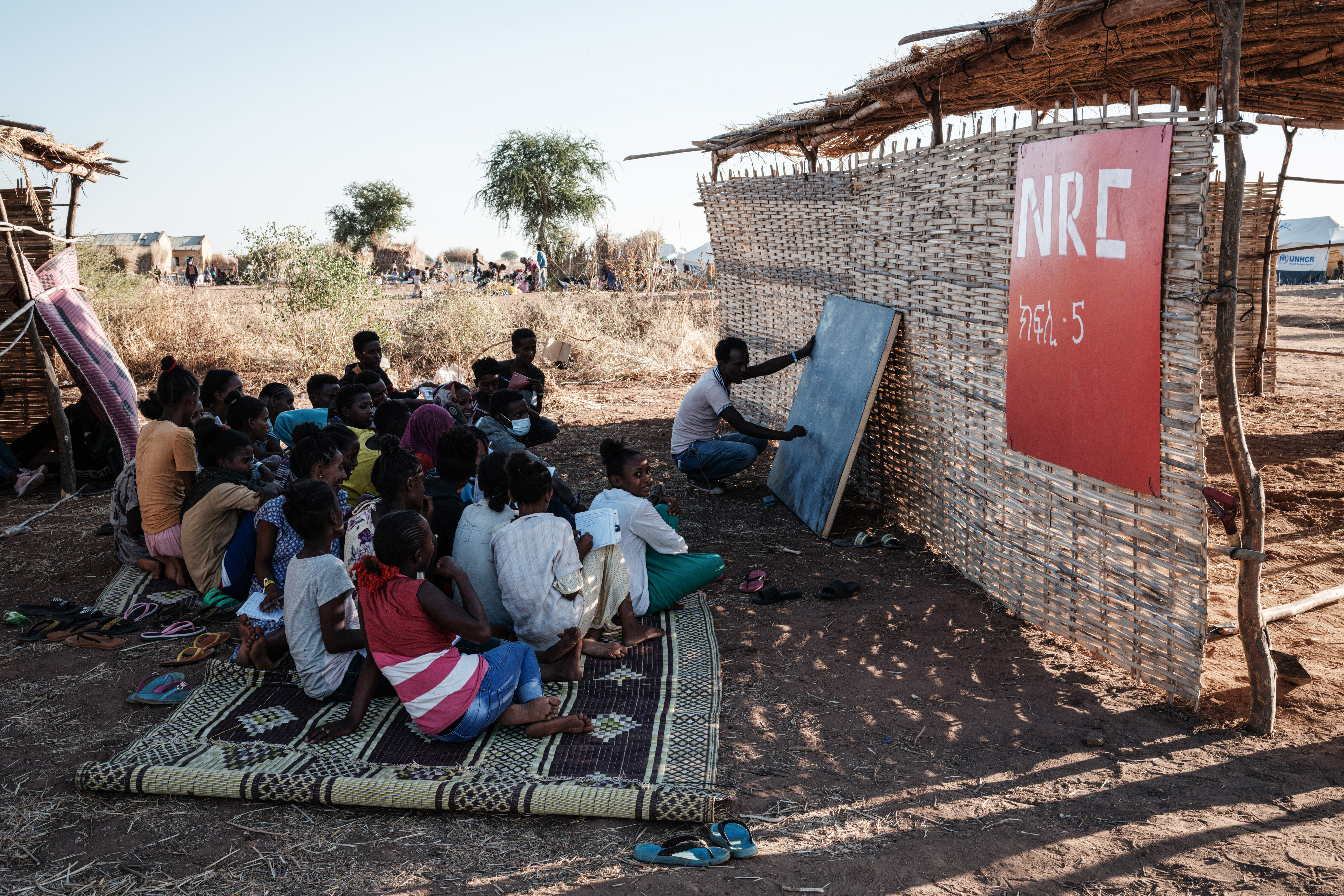An Ethiopian girl sings to her classmates, who are huddled together on a straw mat on the sandy ground of a refugee camp in neighbouring Sudan.