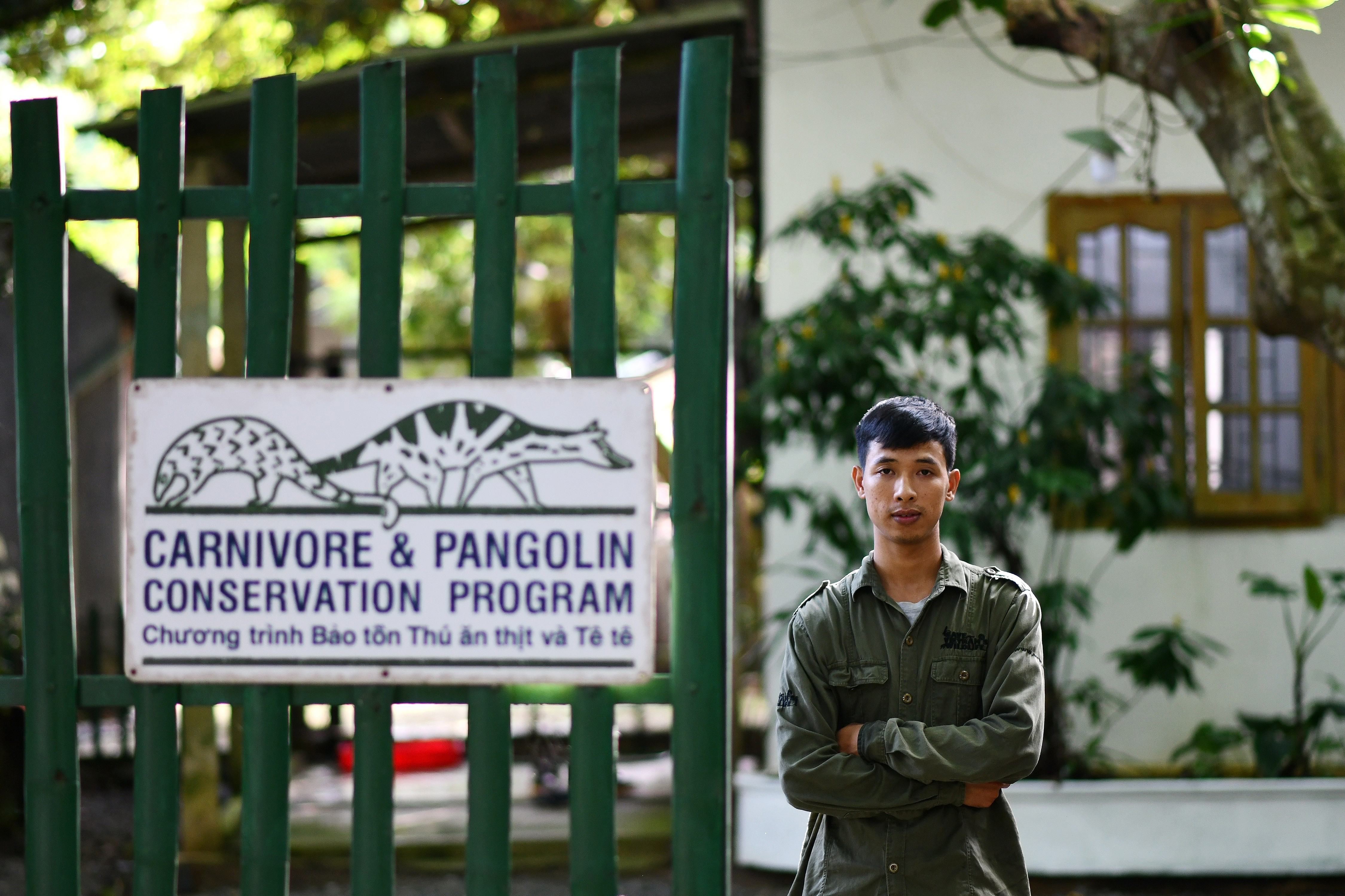 Head keeper Tran Van Truong gently takes a curled-up pangolin into his arms, comforting the shy creature that was rescued months earlier from traffickers in Vietnam.
