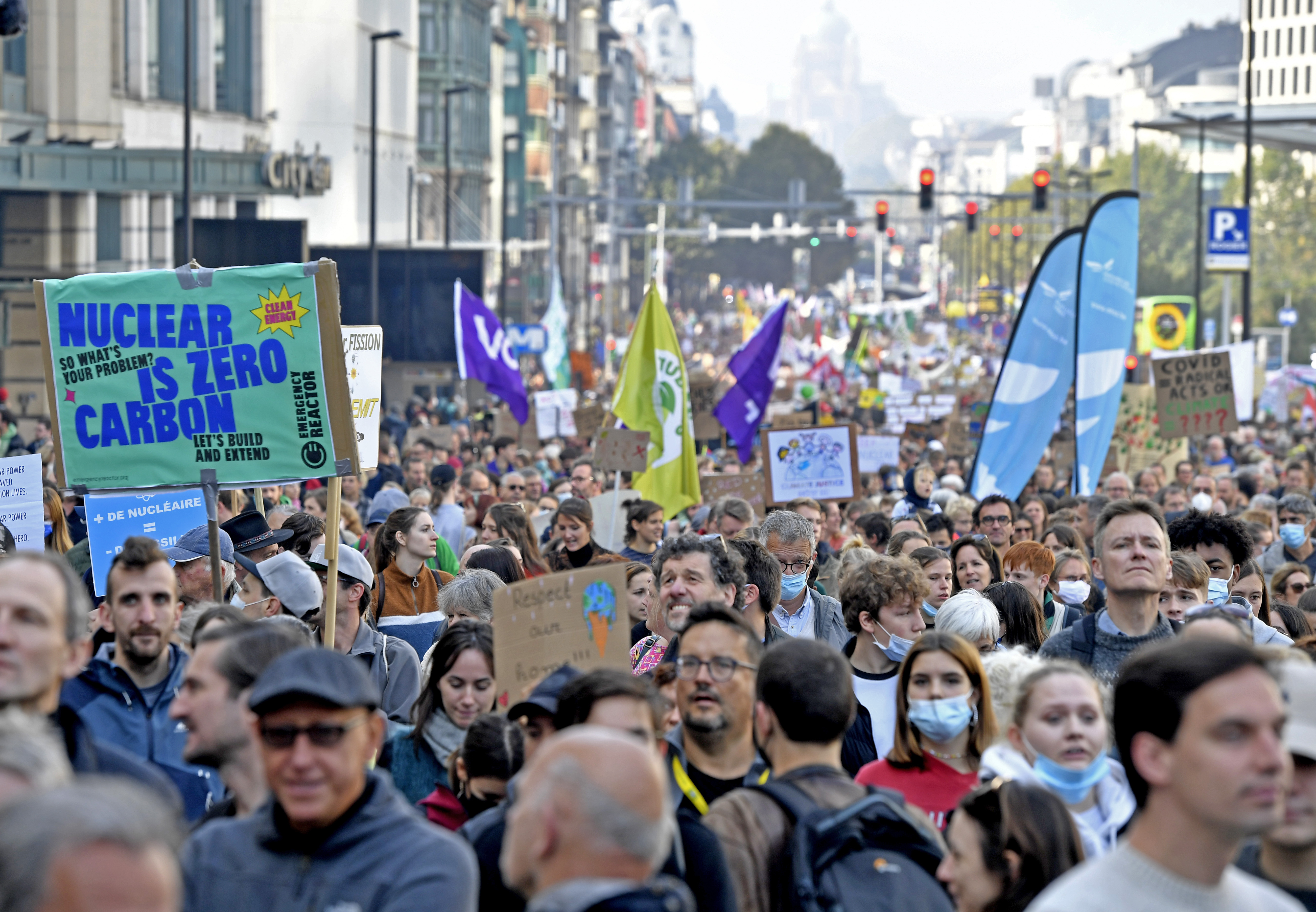 Cyclists, families with children and white-haired demonstrators filled city streets, chanting slogans demanding climate justice and waving banners in English, French and Dutch. One carried a stuffed polar bear on her head, and others were dressed as animals endangered by human-caused climate change.
