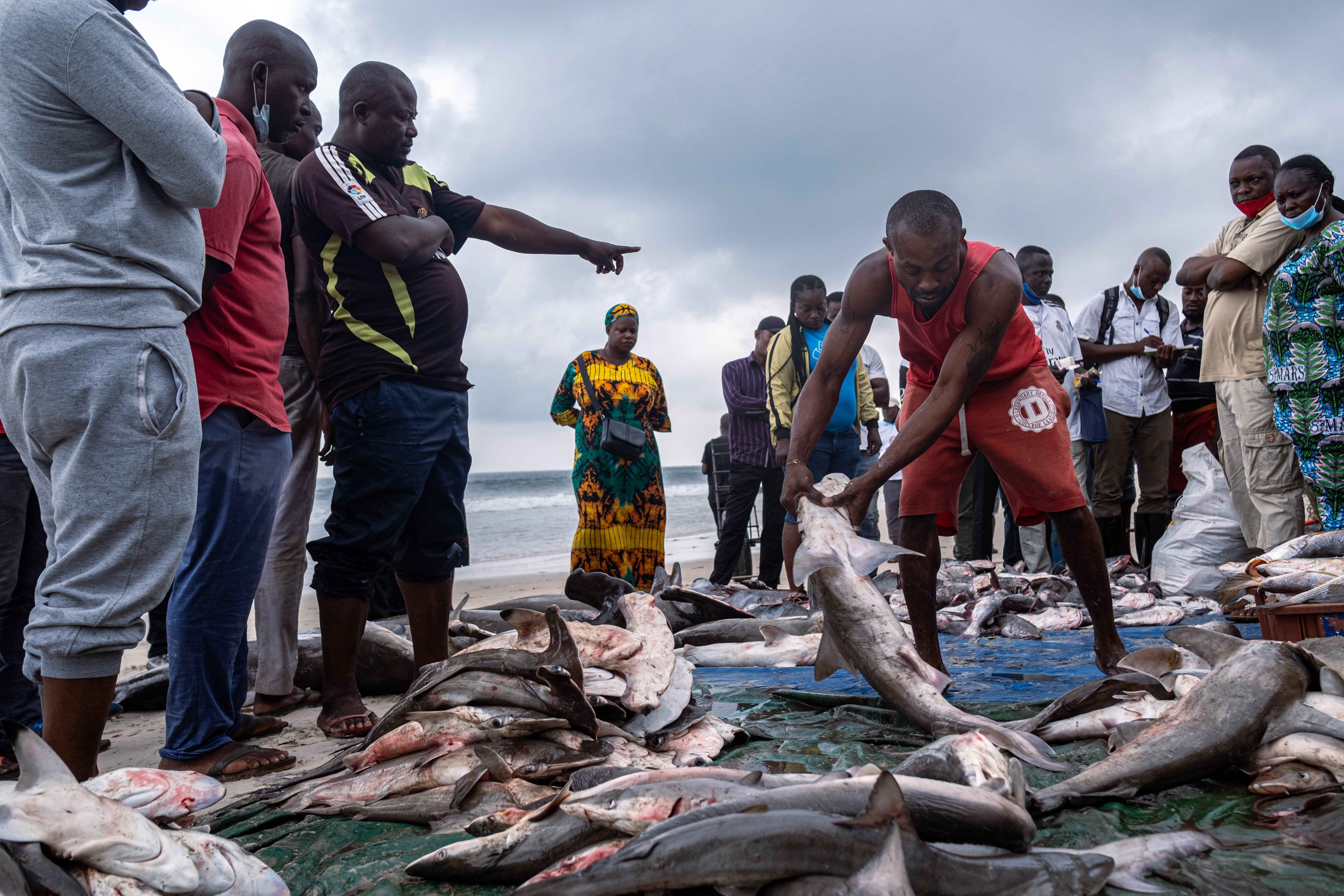 On most days, hundreds of sharks are dumped along the beach of Songolo in the fishing district of Pointe-Noire, where they are sold on the spot. Many are hammerhead, bigeye thresher, silky, and mako sharks – all endangered species.