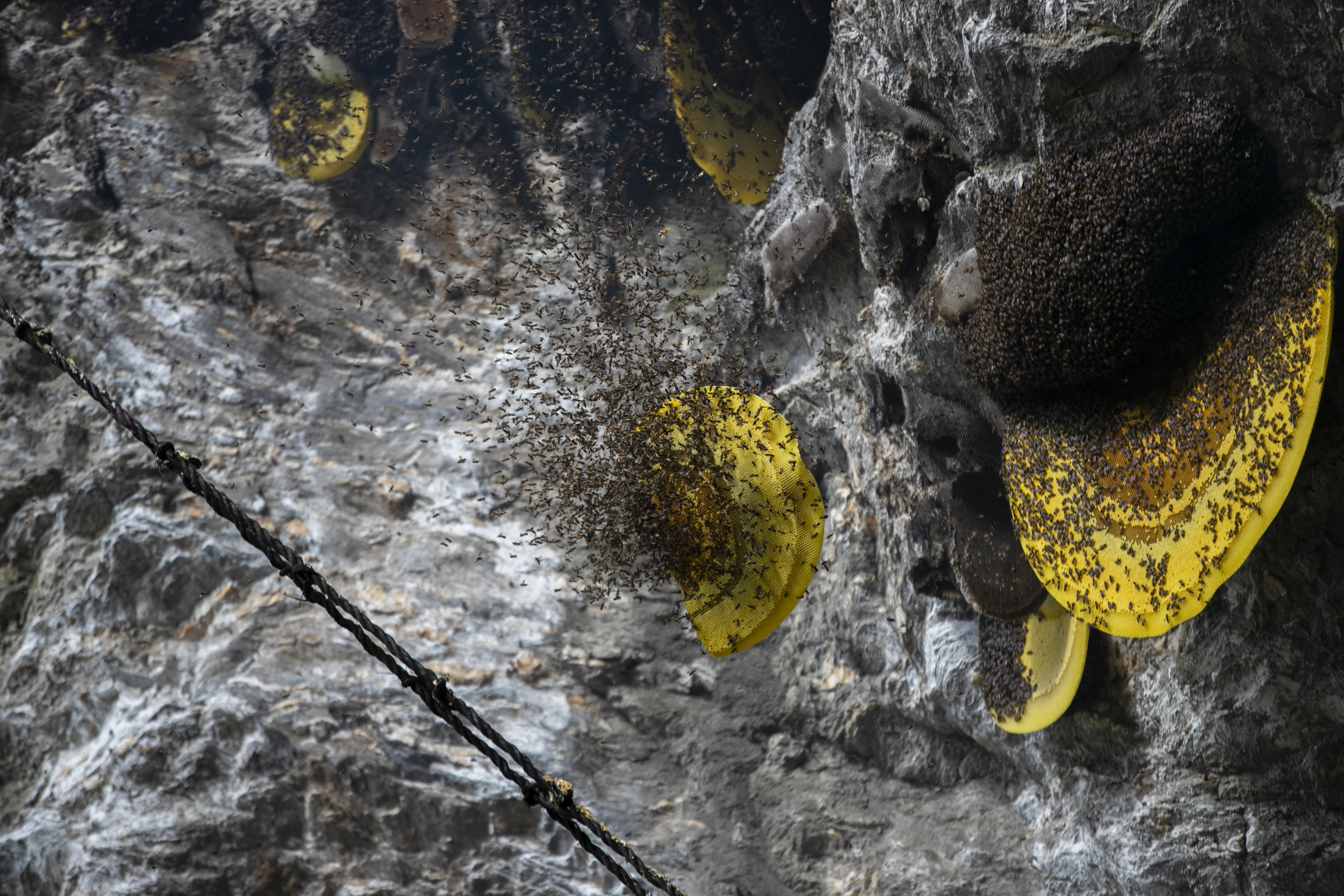 High up in Nepal’s mountains, groups of men risk their lives to harvest much sought-after wild honey from hives on cliffs.