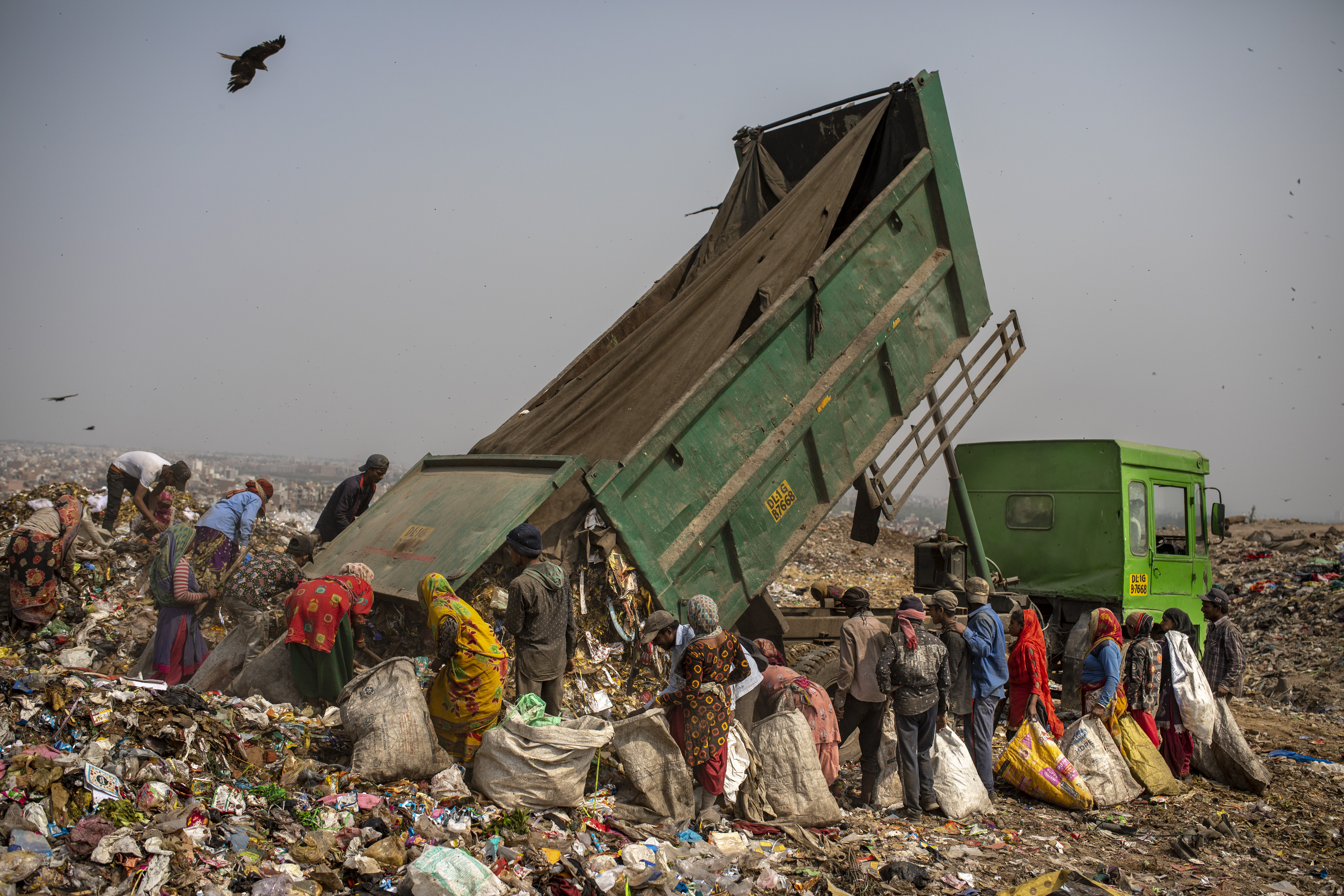 The scavengers wait patiently for a dump truck to tip the rubbish on the summit of the landfill outside India’s capital New Delhi. Armed with plastic bags, they plunge their bare hands into the rubbish and start sorting it.