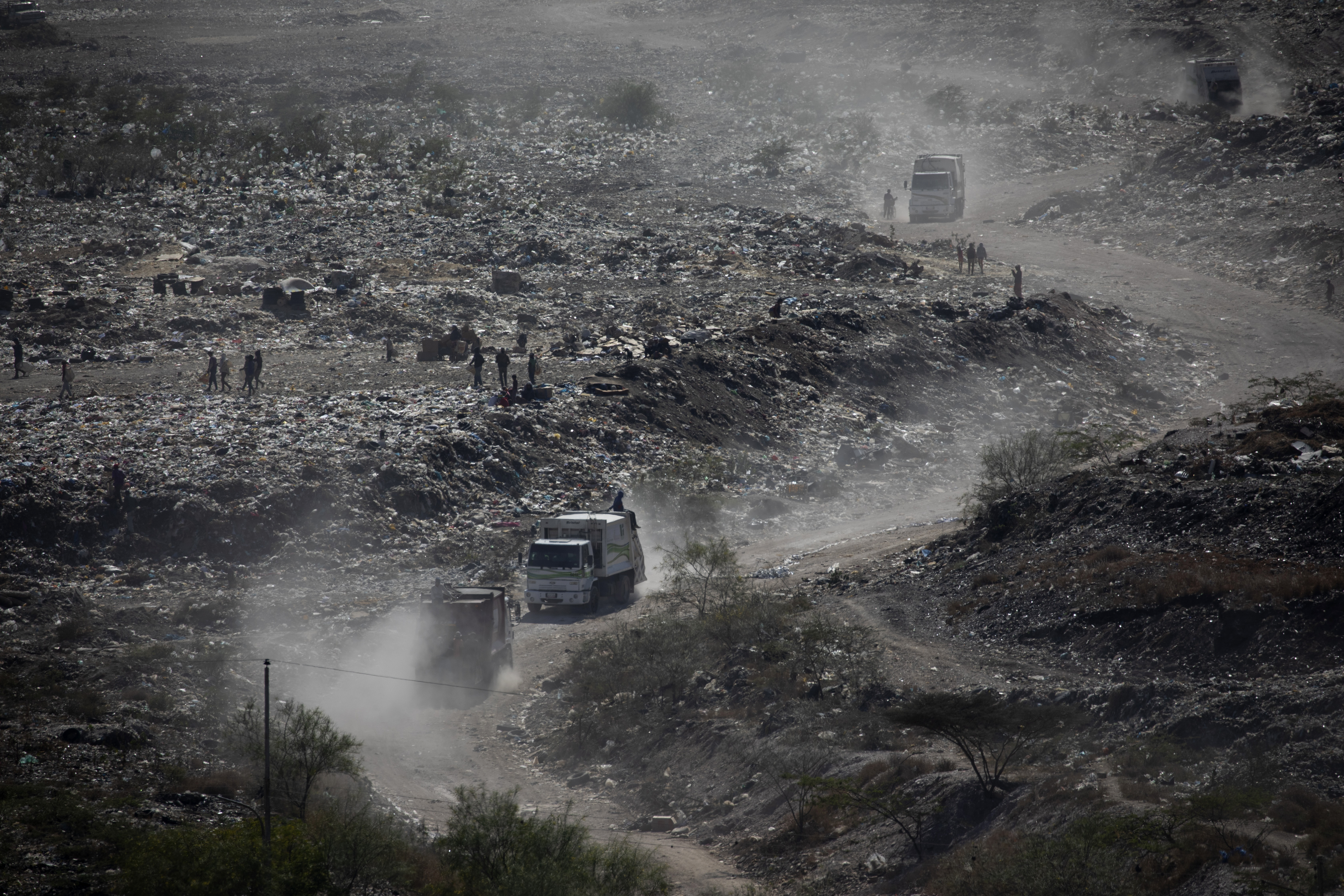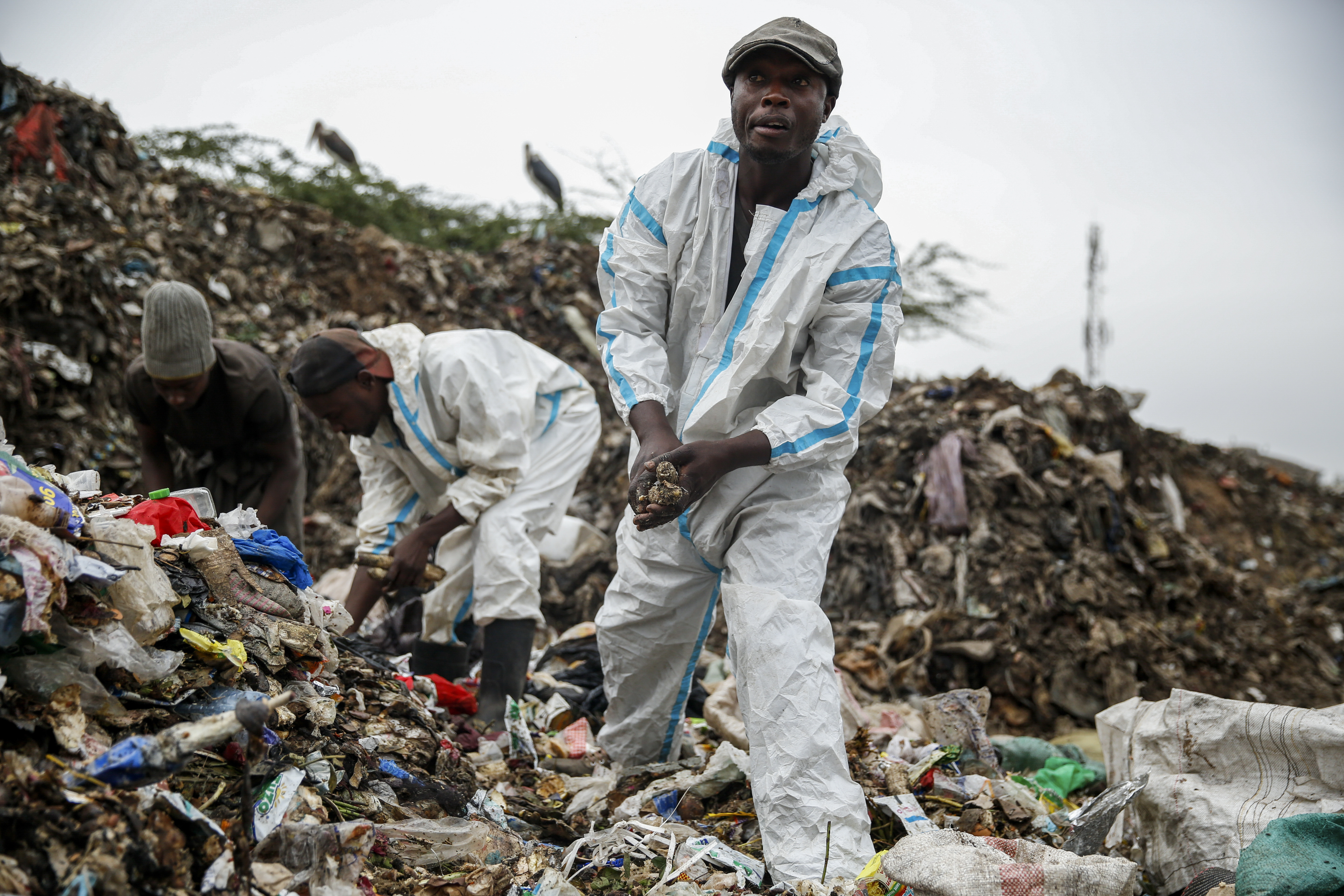 At the Dandora landfill in Kenya’s capital of Nairobi, some of the scavengers who are not eligible for a shot don medical gear discarded by hospitals and health clinics, saying it especially protects them from the weather during the rainy season.