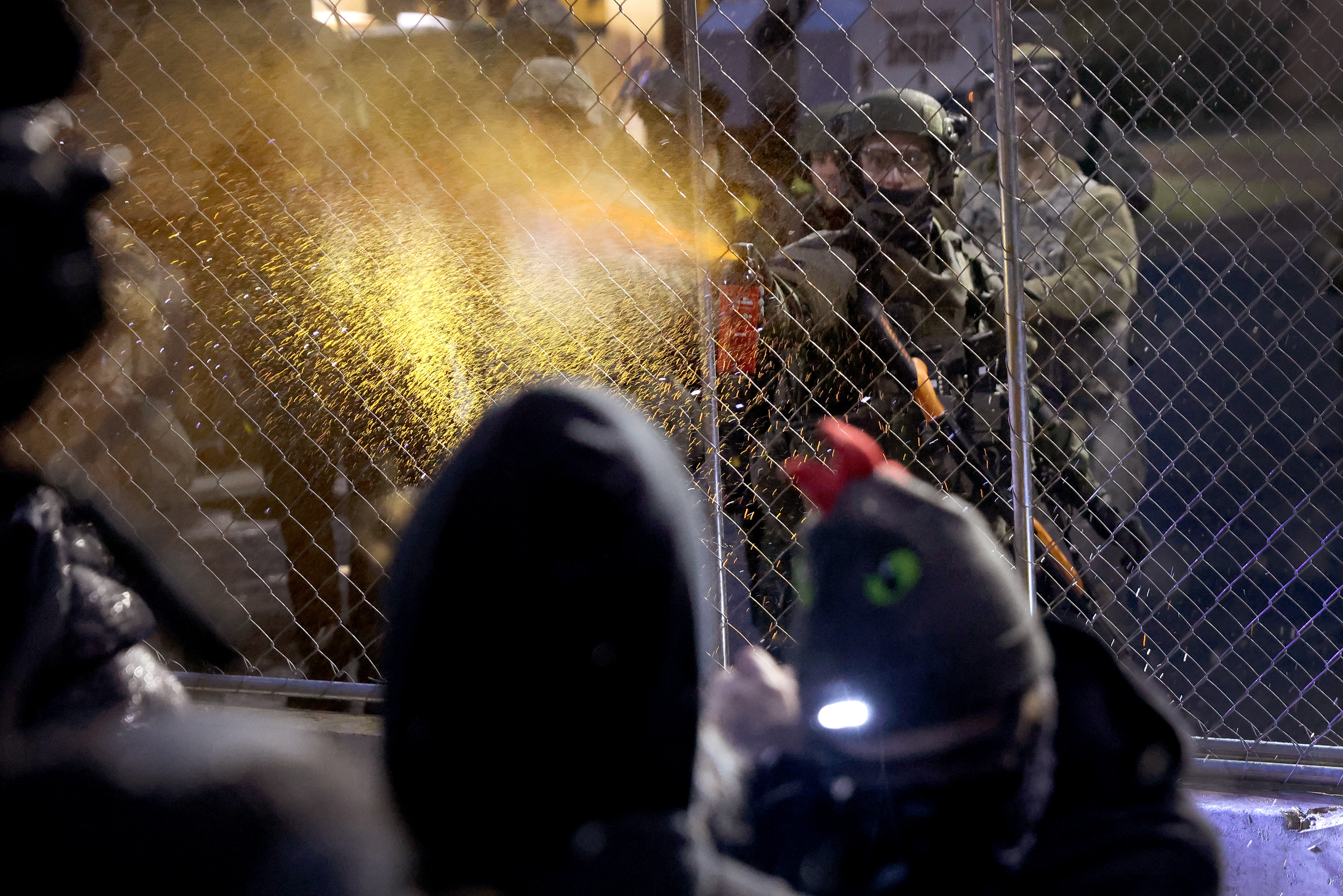 Police in the Minneapolis suburb of Brooklyn tried to chase the crowd away but some protesters picked up smoke canisters and threw them back towards police as others shot fireworks towards the patrolling officers.