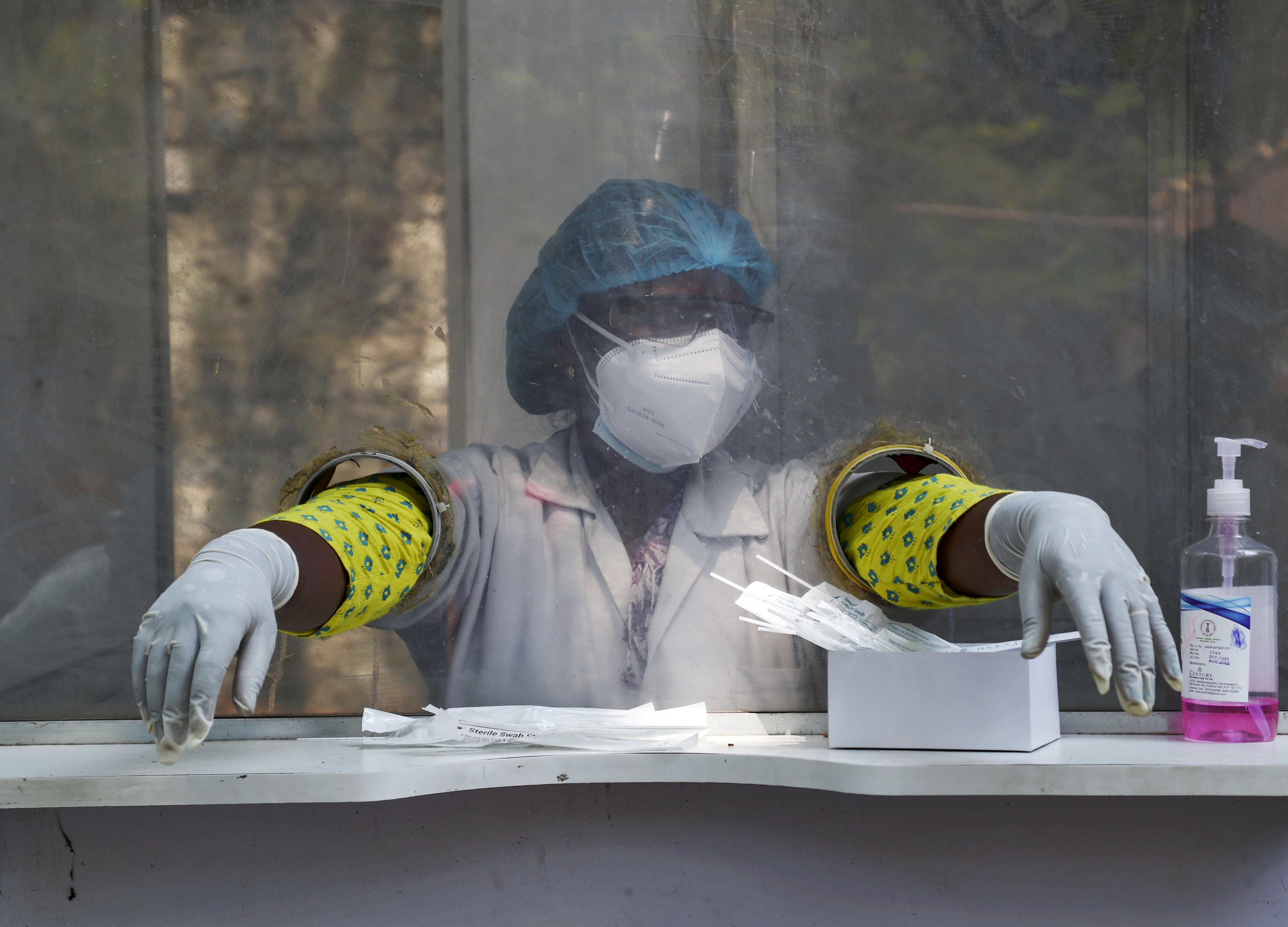 An Indian health worker takes a break while waiting to collect swab samples for COVID-19 test in Hyderabad. [Mahesh Kumar A./AP Photo]