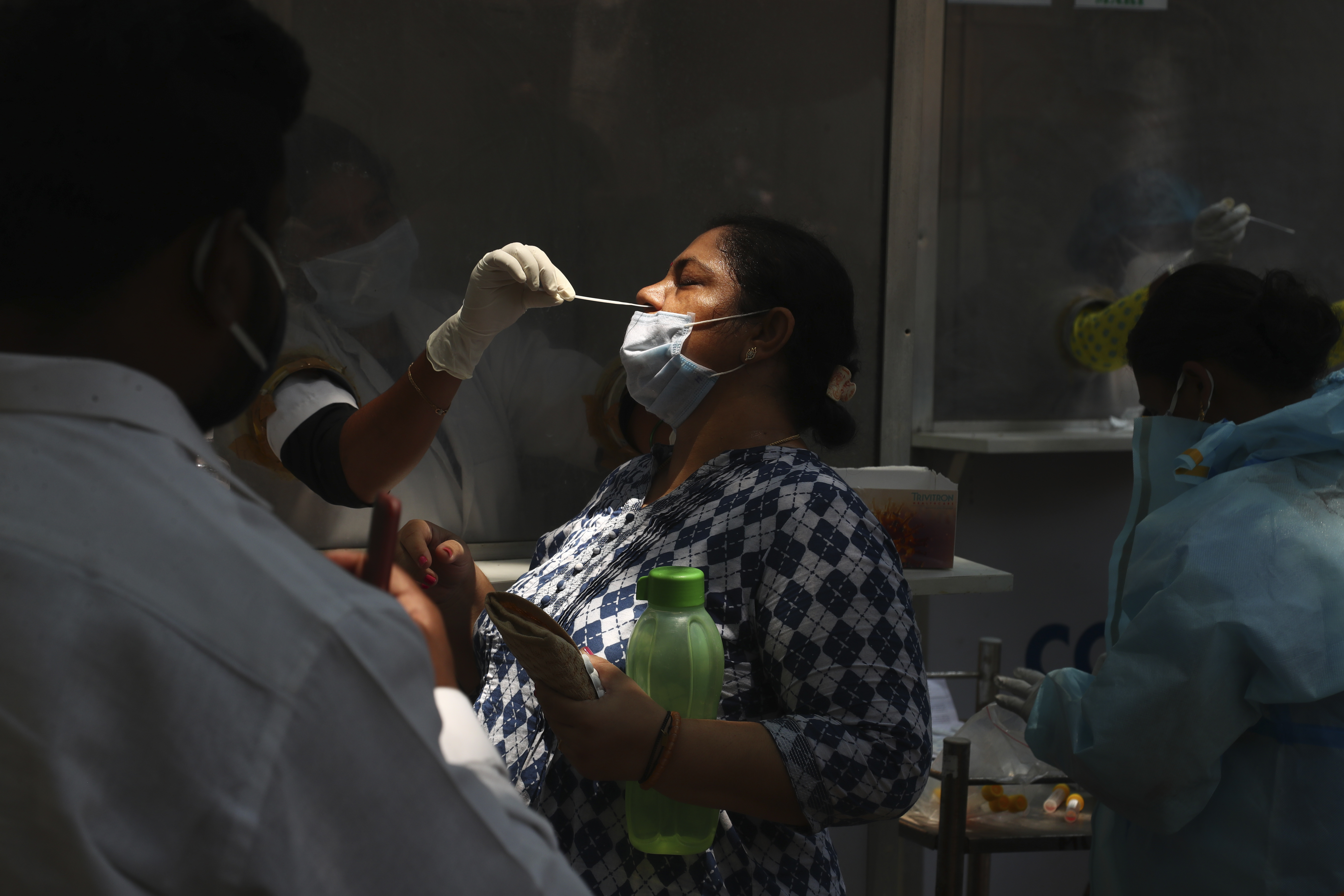 A health worker takes a nasal swab sample of a woman to test for COVID-19 in Hyderabad. [Mahesh Kumar A./AP Photo]