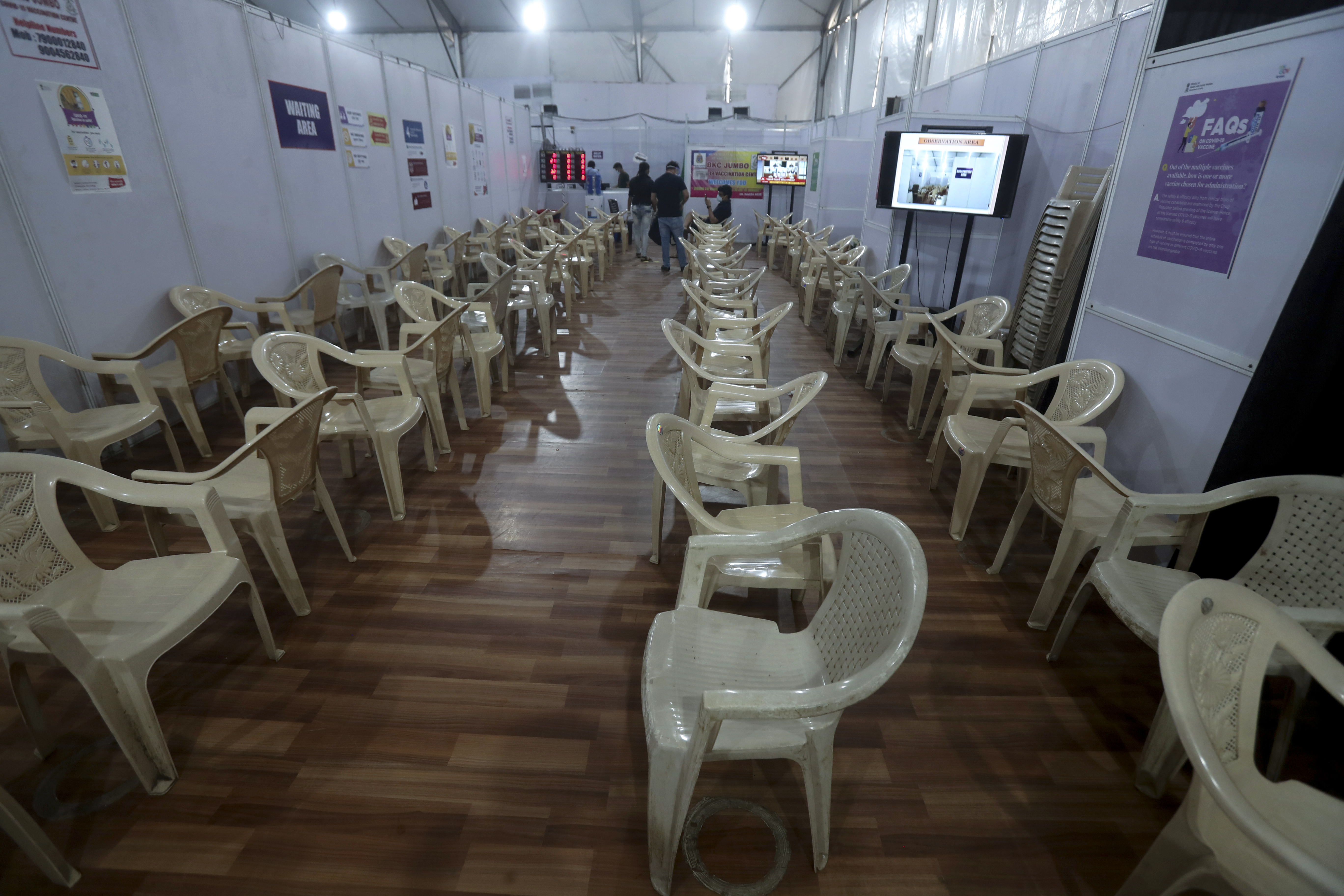 Health workers sit in the waiting area of a vaccination centre which has been closed because of shortage of the COVID-19 vaccine in Mumbai. [Rafiq Maqbool/AP Photo]
