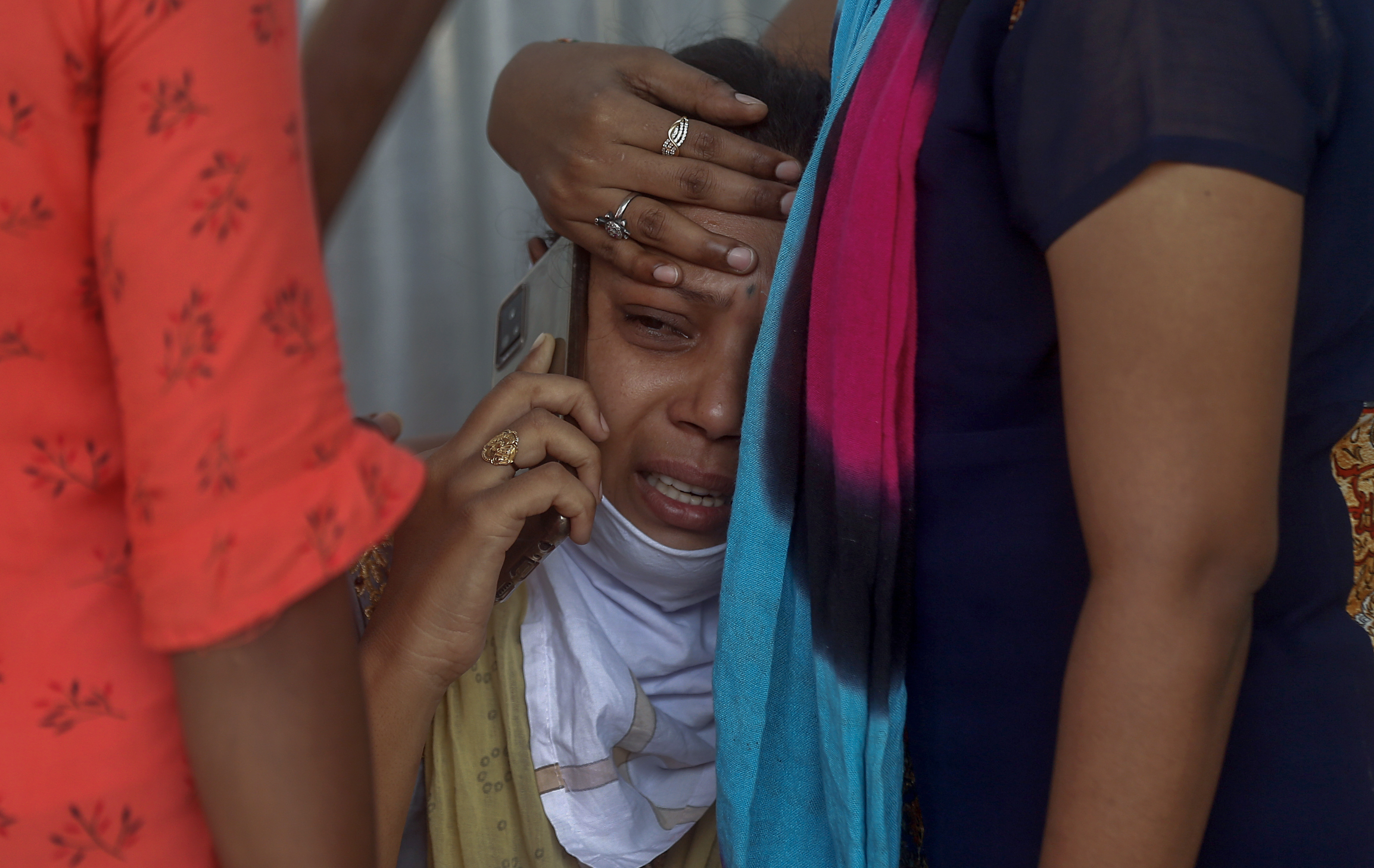 Relatives of a person who died of COVID-19 mourn outside a field hospital in Mumbai. [Rafiq Maqbool/AP Photo]