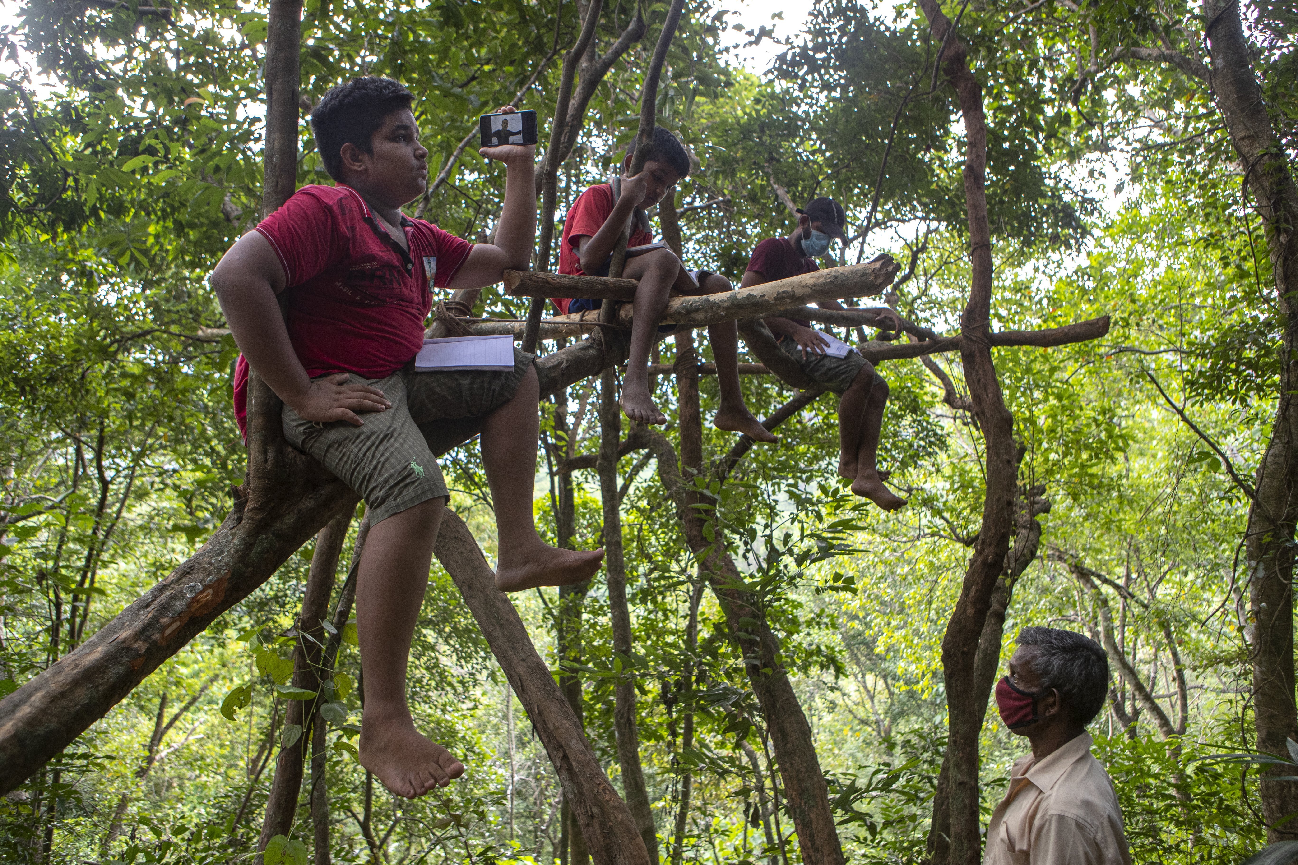 In the village of Lunugala, some 60km (37 miles) away, adults escort schoolchildren to a mountaintop treehouse in a forest reserve. It is about 30 feet high and has internet access. They take turns to upload their homework and download lesson plans.