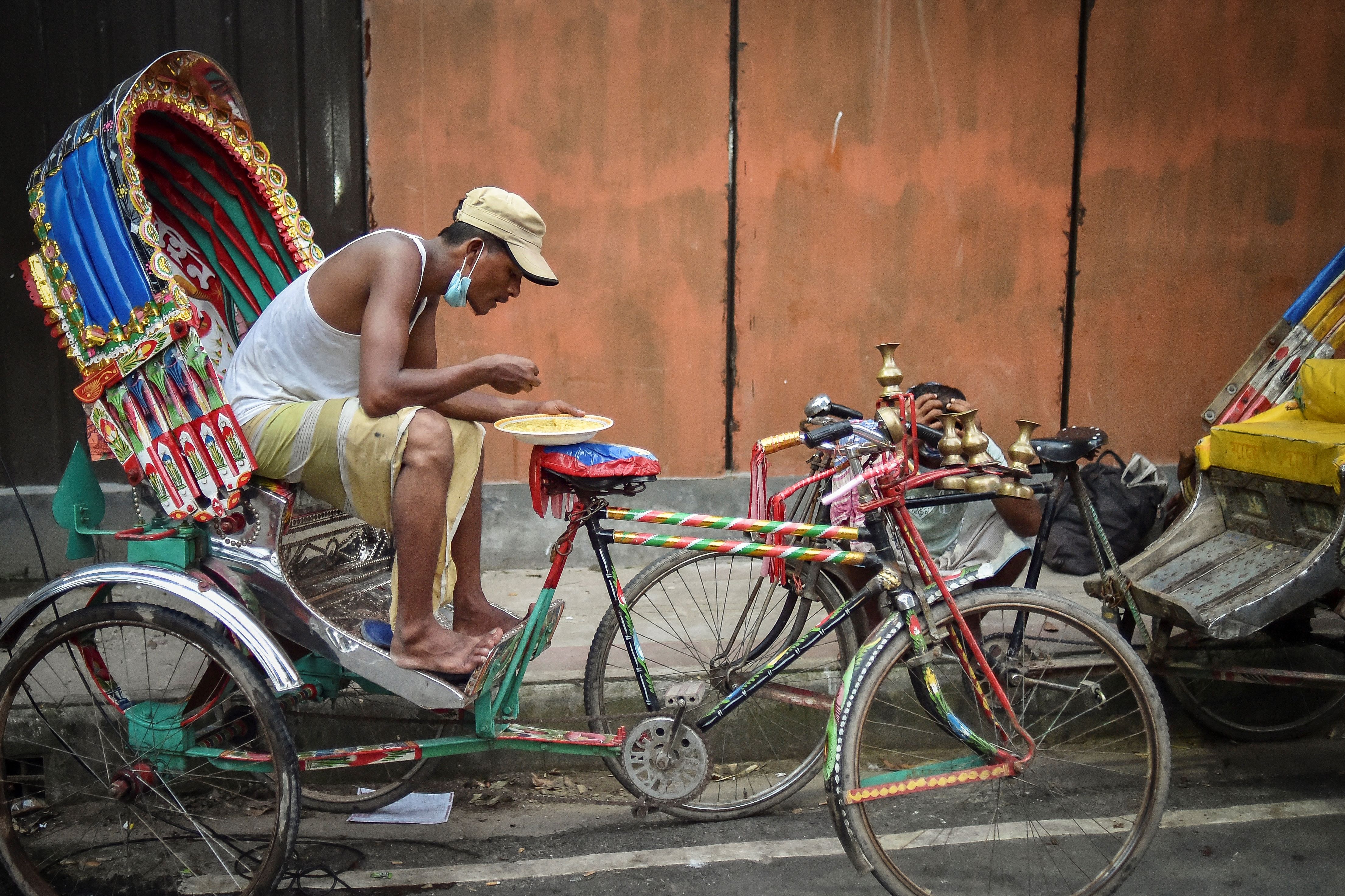 Mohammad Masud braves Dhaka’s sweltering summer heat to pedal across the Bangladeshi capital in his rickshaw and queue at one of the last charities still feeding those left destitute by the pandemic.