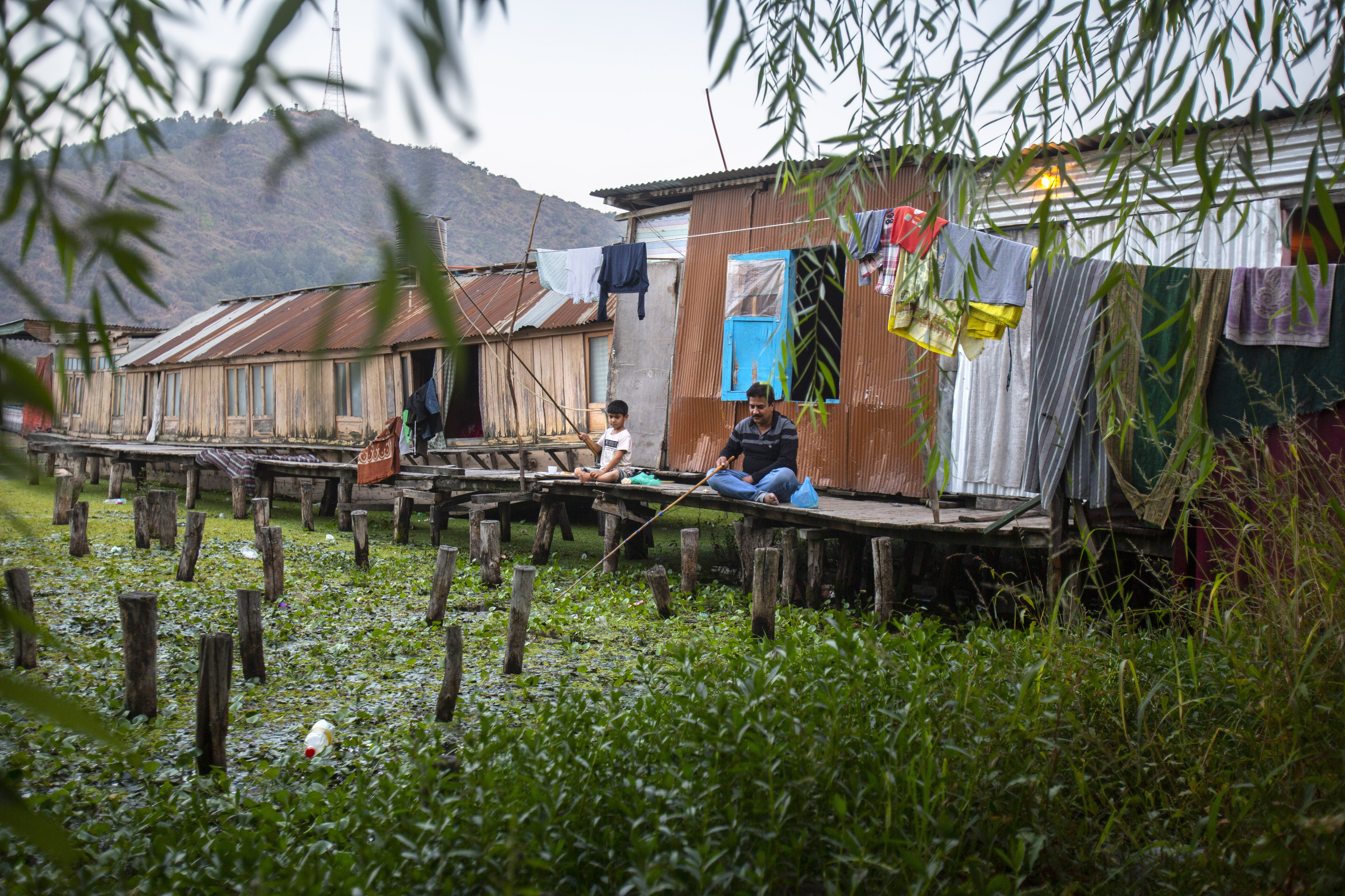Partially submerged houseboats are seen near a shanty over the Dal Lake in Srinagar. [Mukhtar Khan/AP Photo]