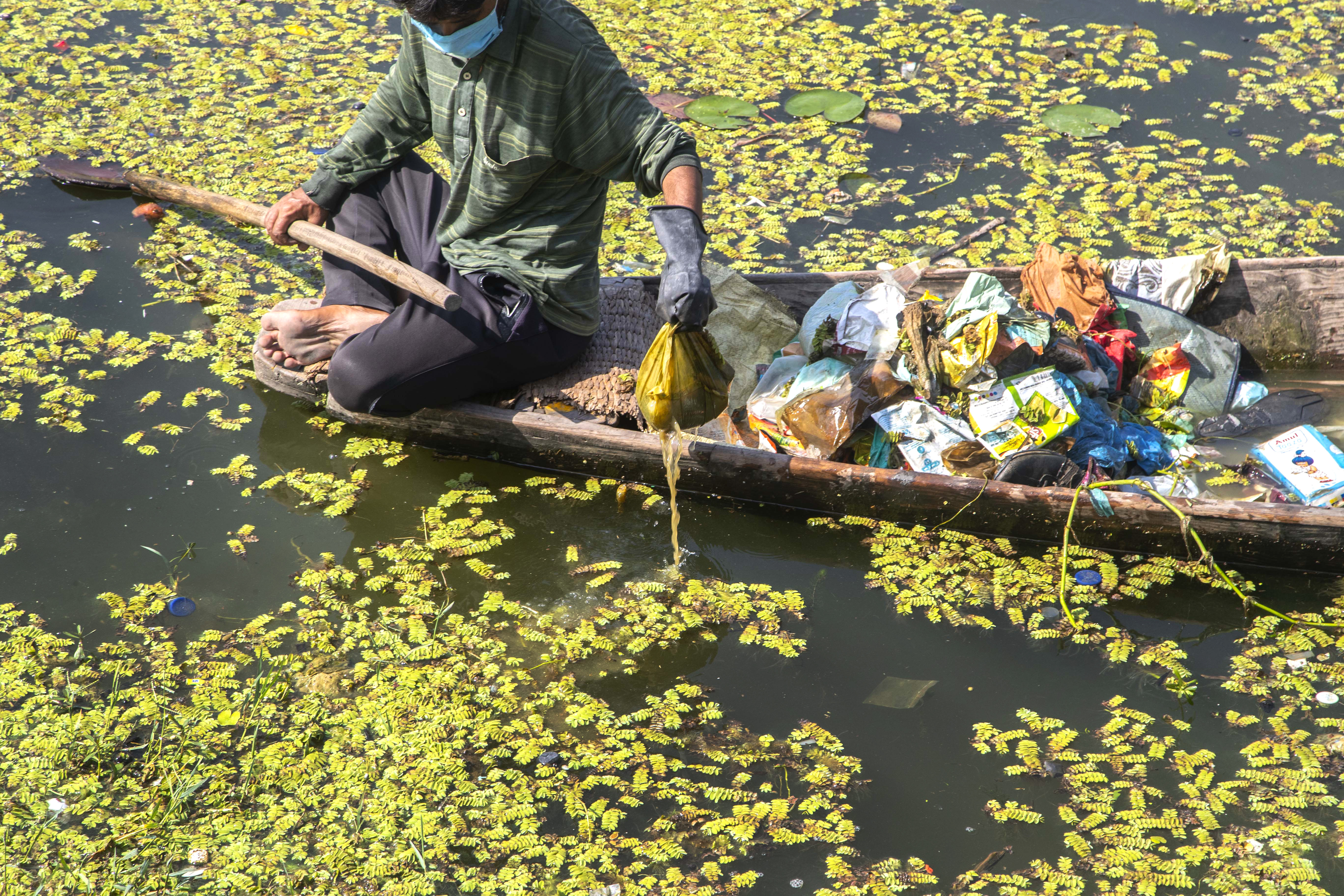 A Kashmiri boatman removes garbage from the famous lake visited by tens of thousands of tourists every year. [Mukhtar Khan/AP Photo]