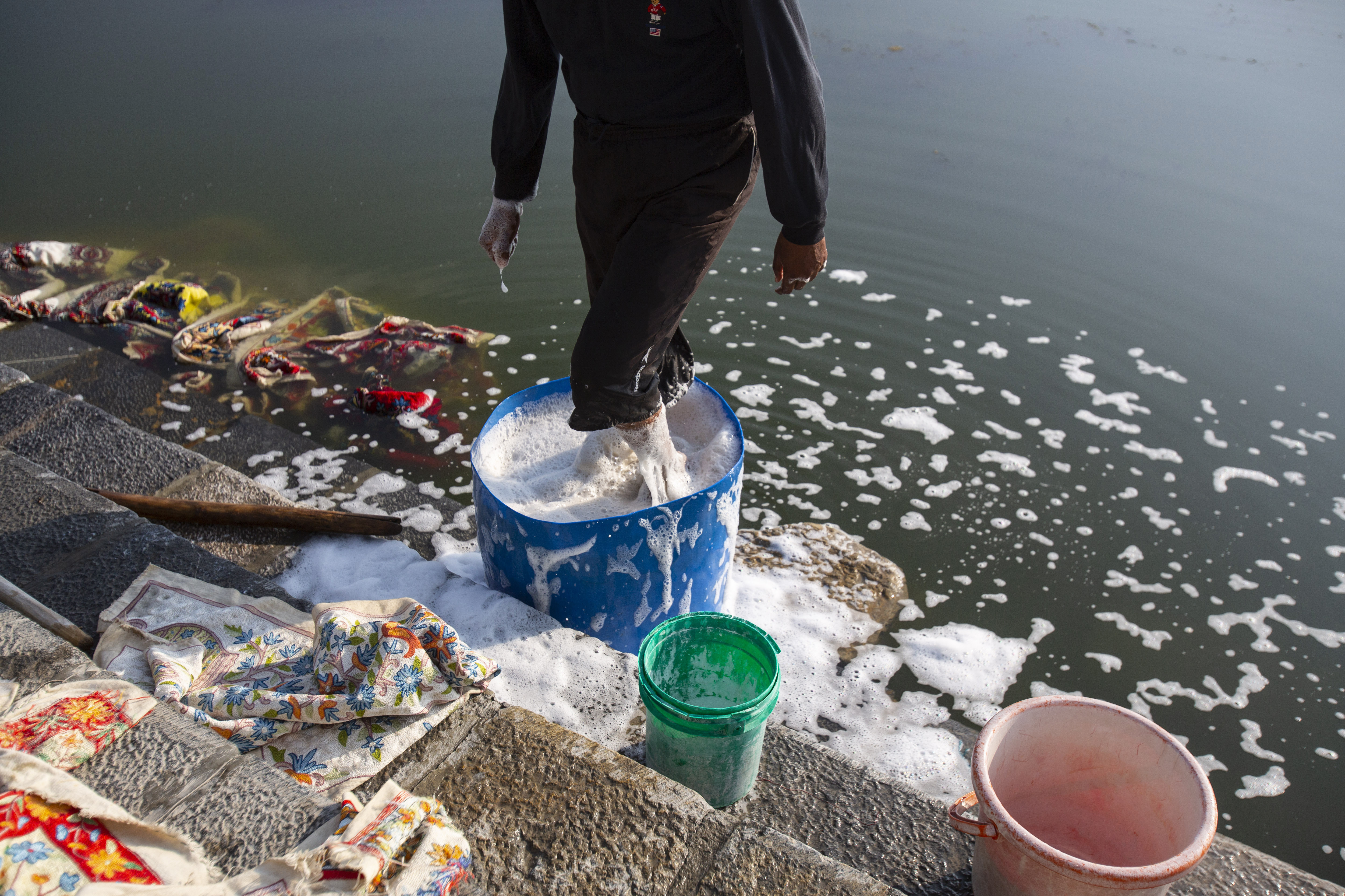 A Kashmiri worker washes clothes on the banks of Dal Lake. [Mukhtar Khan/AP Photo]