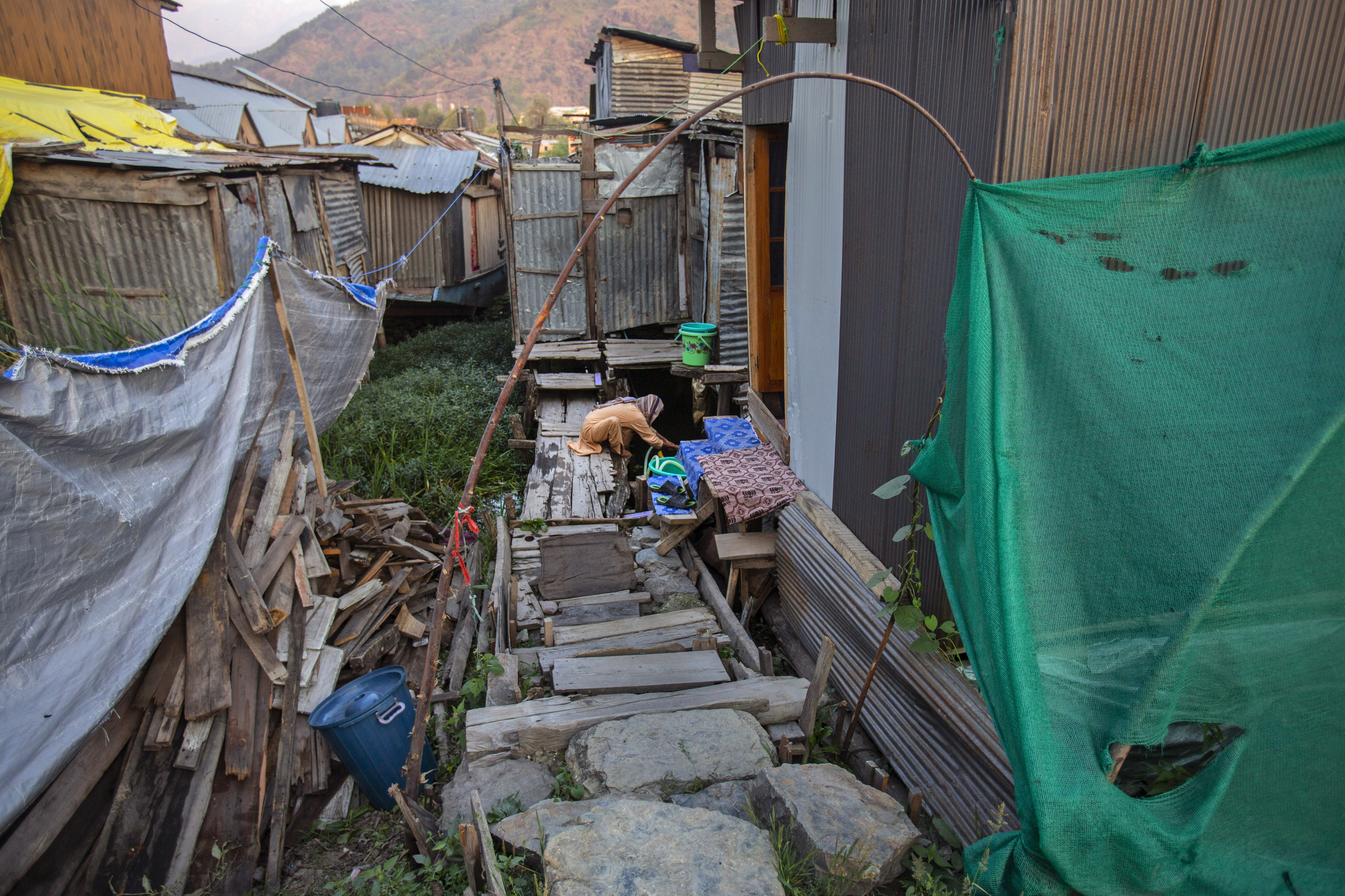 A Kashmiri woman collects water outside her shanty over the Dal Lake in Srinagar. [Mukhtar Khan/AP Photo]