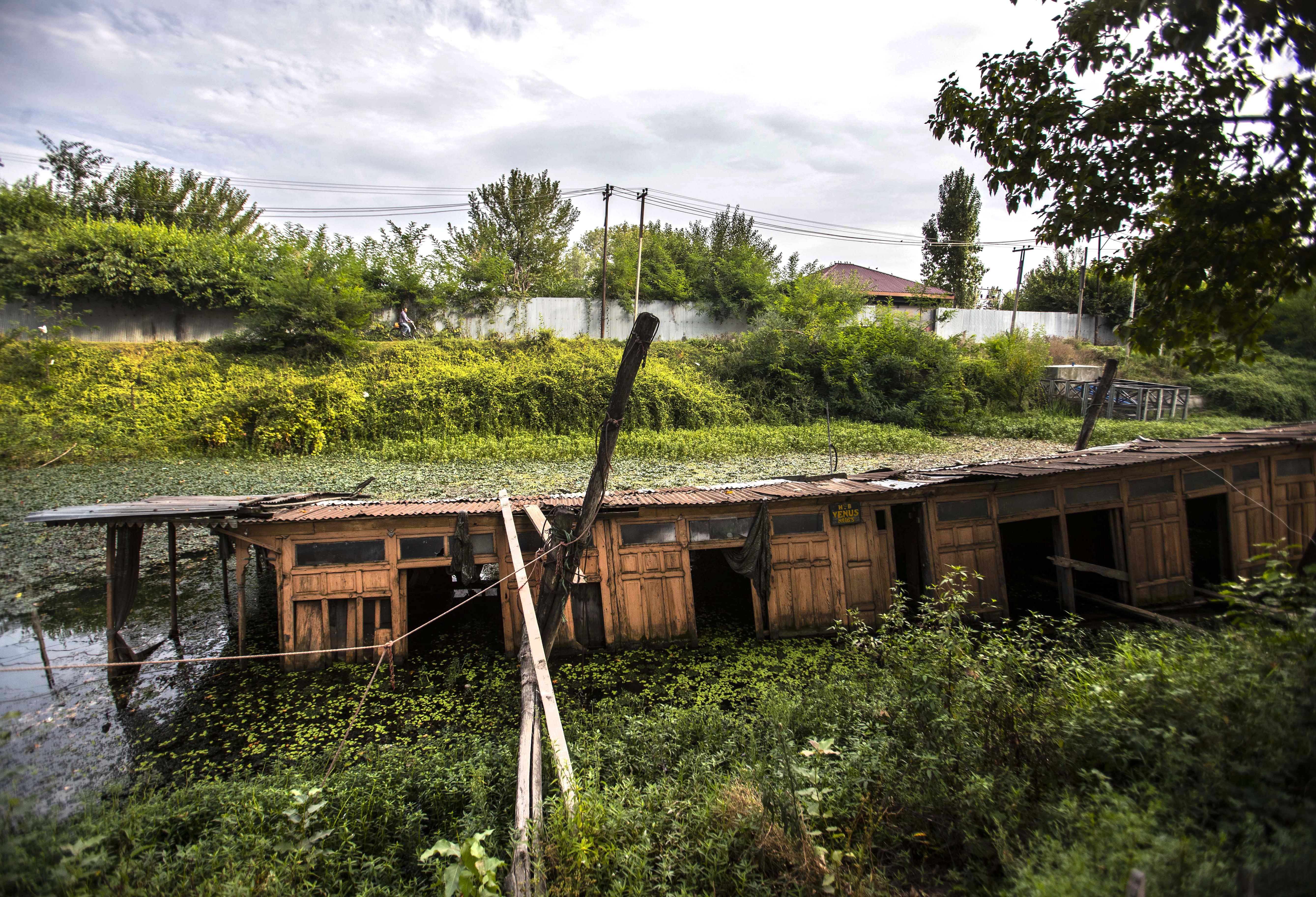 A decrepit houseboat lies surrounded by weeds in the iconic Dal Lake. [Mukhtar Khan/AP Photo]