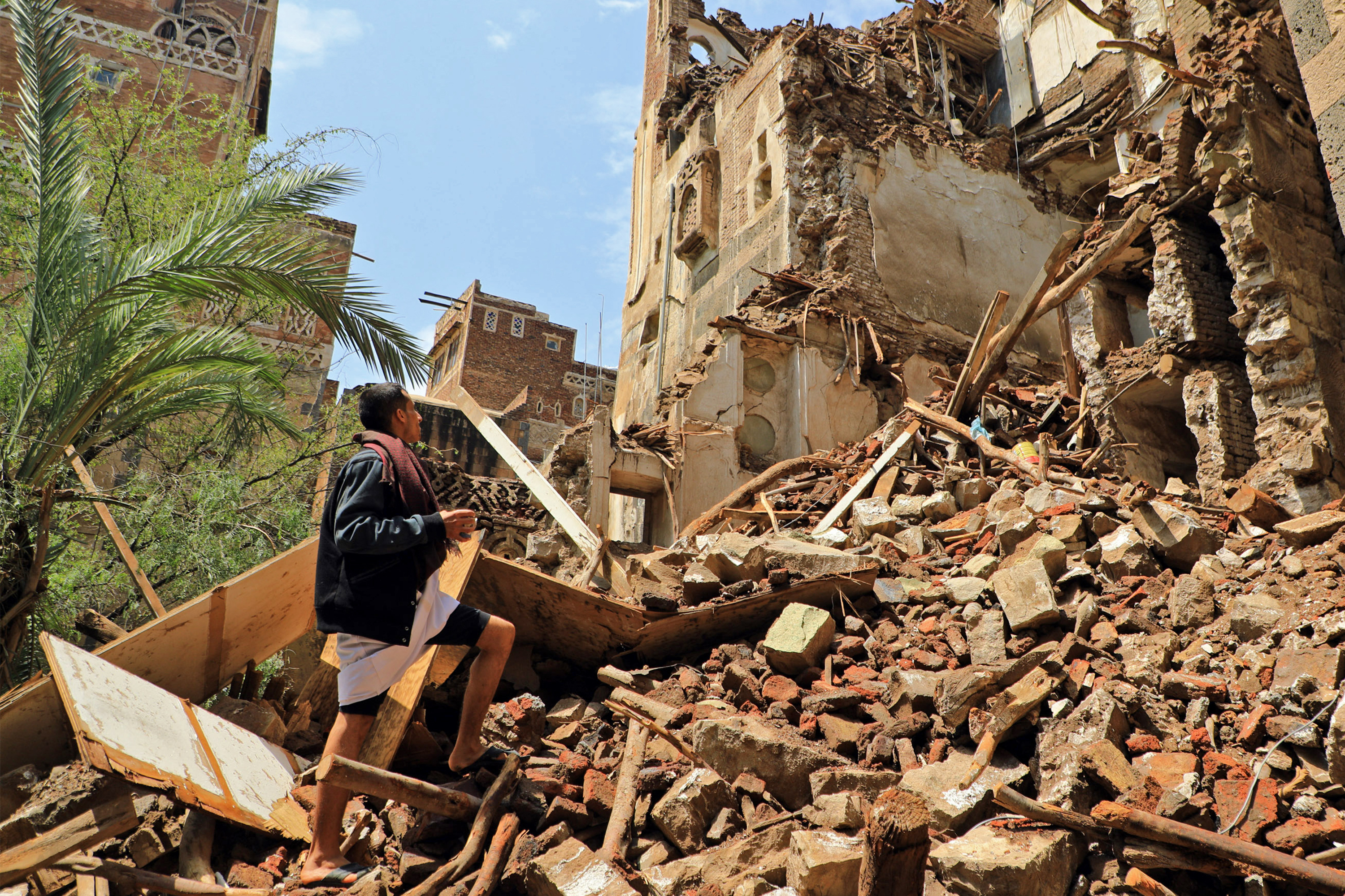 A man inspects a collapsed UNESCO-listed building in Sanaa's Old City. [Mohammed Huwais/AFP]