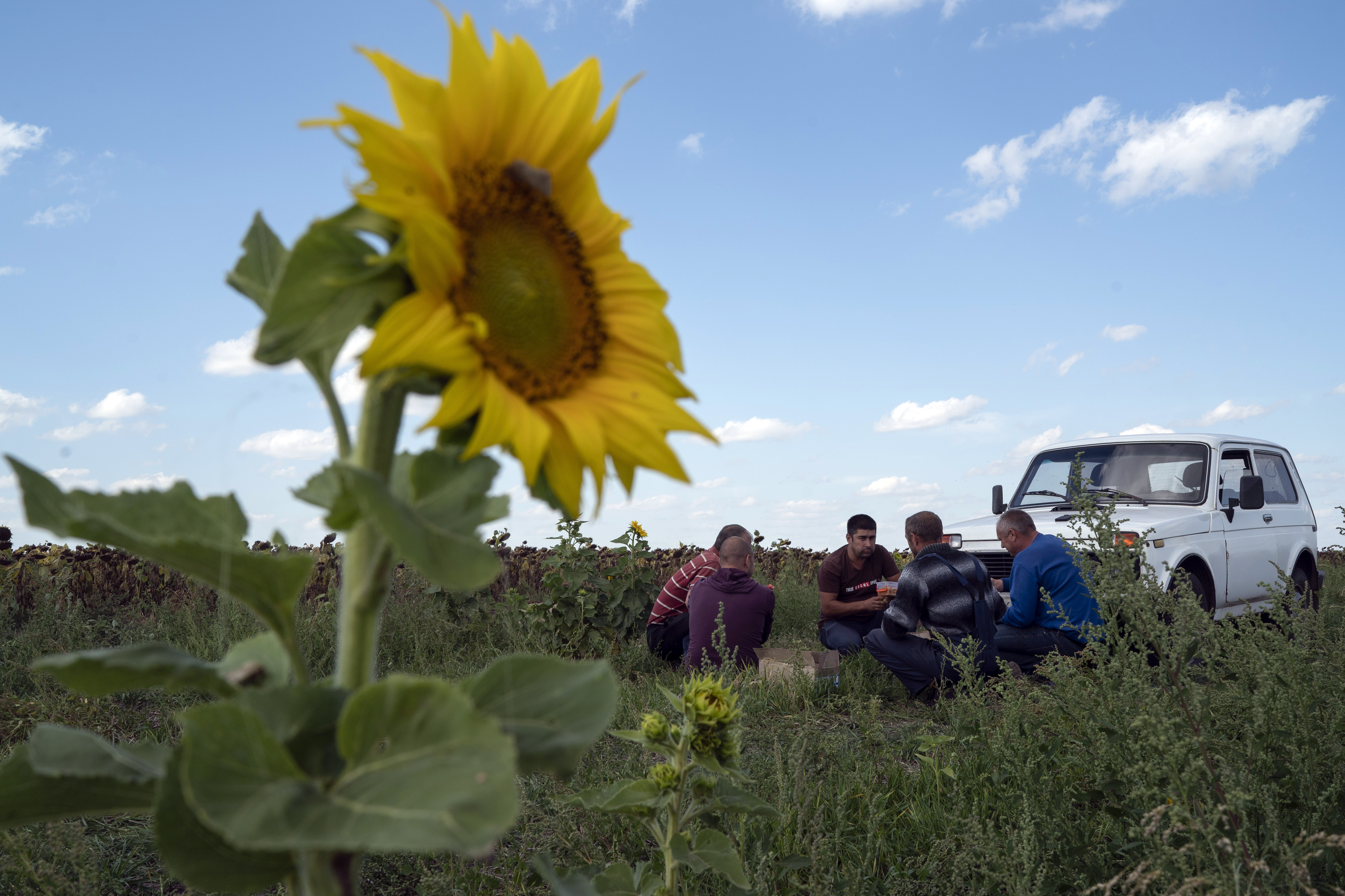 Some farms in the area have been luckier. Nearly 10km (6 miles) to the southwest of Novomykolaivka, a combine harvester moves methodically up and down a field, slicing dried sunflowers from their stalks and pouring their black seeds into waiting trucks.