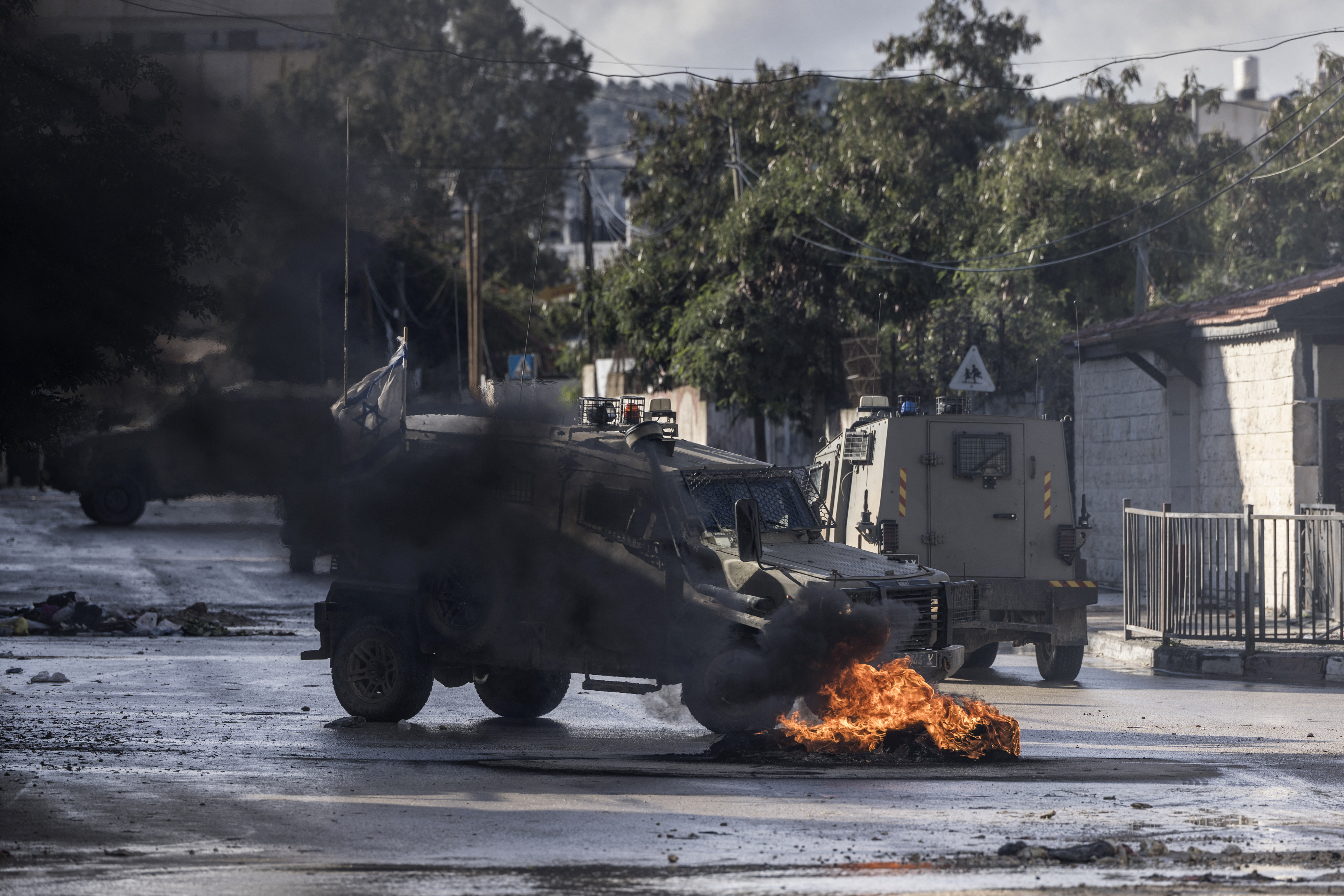 ![Israeli army vehicles are seen near burning tyres during the raid at the entrance to the Jenin refugee camp in the occupied West Bank. [Marco Longari/AFP]](/wp-content/uploads/2023/12/347V92A-highres-1702545074.jpg?resize=770%2C513&quality=80)