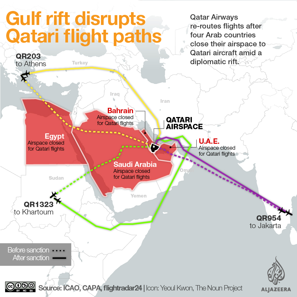 Qatar Airways flights initially had to take an easterly route to fly only over airspace that was open to them.