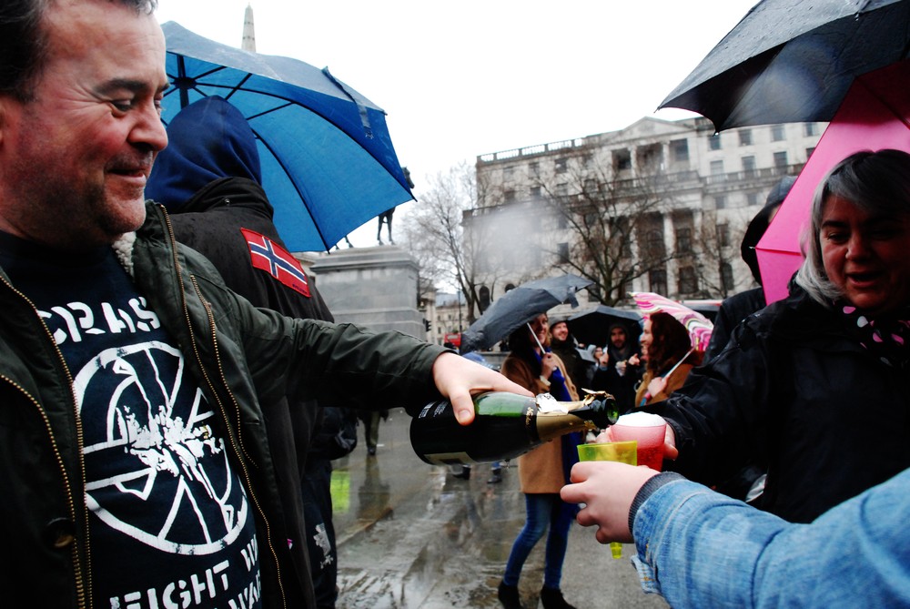 The notorious British rain poured down, but failed to dampen spirits of those gathered, who stayed in the square until around 2am.