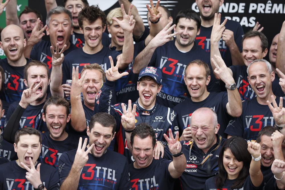 Brazil, 2012: After Singapore, Vettel won the next three races but the season went down to the wire. Vettel waited until the last race of the season in Interlagos, and needed to overcome a first-lap crash, to seal his third consecutive title. The German finished the race sixth but that didn(***)t wipe the smiles off Red Bull(***)s faces as they once again dominated F1.