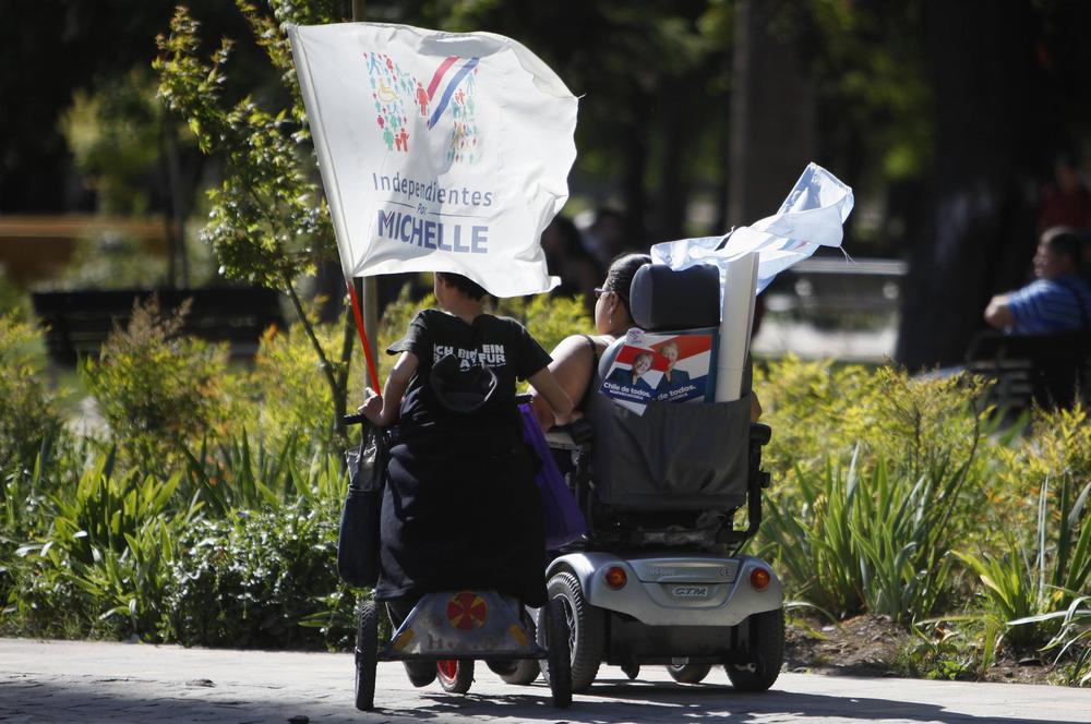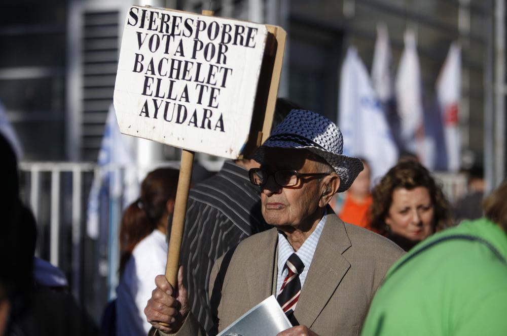 A voter is carrying a sign that reads "if you are poor, vote for Bachelet, she will help you". The text refers to Michelle Bachelet, a candidate from the centre-left New Majority coalition.