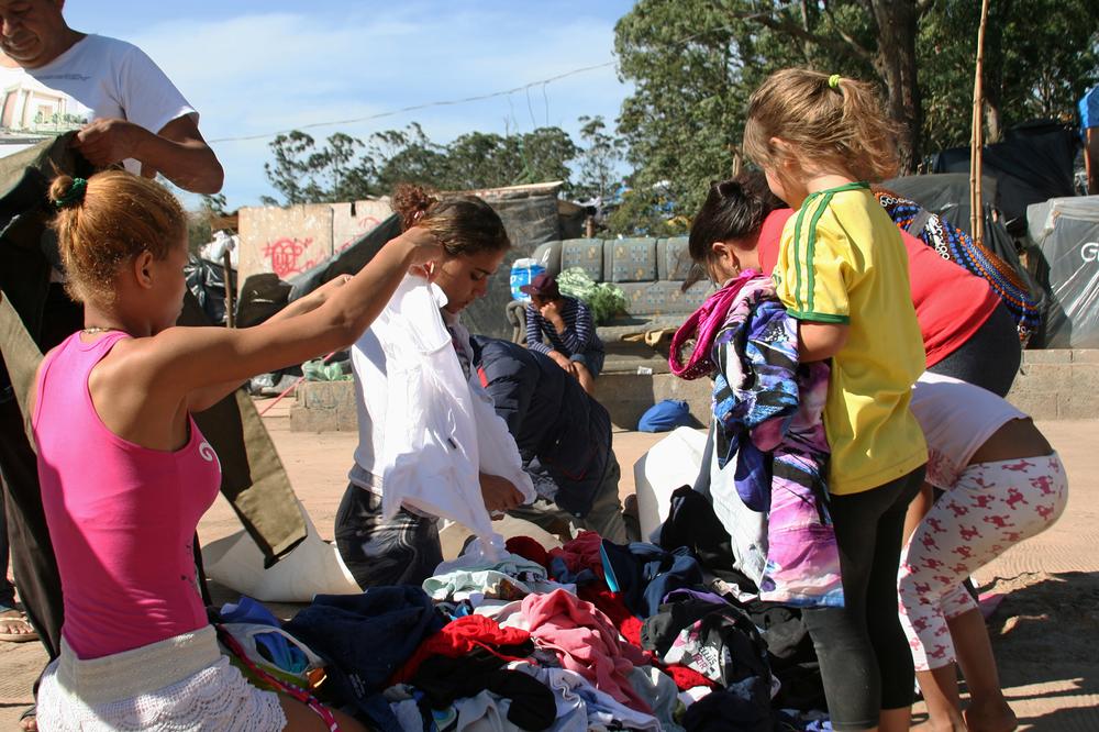 The camp relies entirely on donated food and clothing. A group of women and children sort through discarded clothes and shoes for new items.