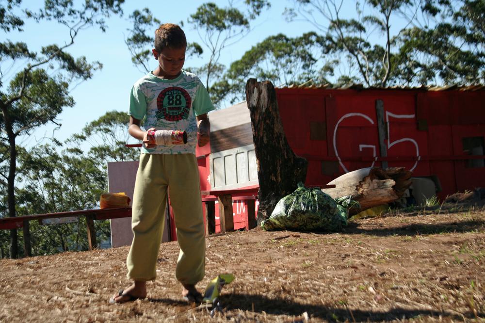At the top of a hill above the "People(***)s Camp", a small boy reels in a plastic yellow kite before he gets bored and discards it.