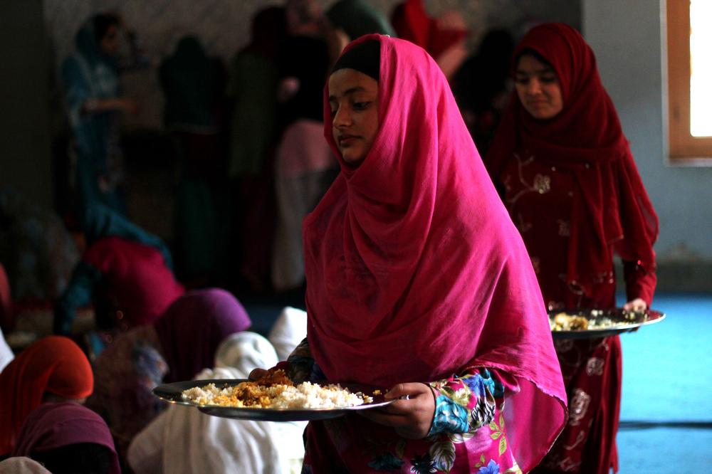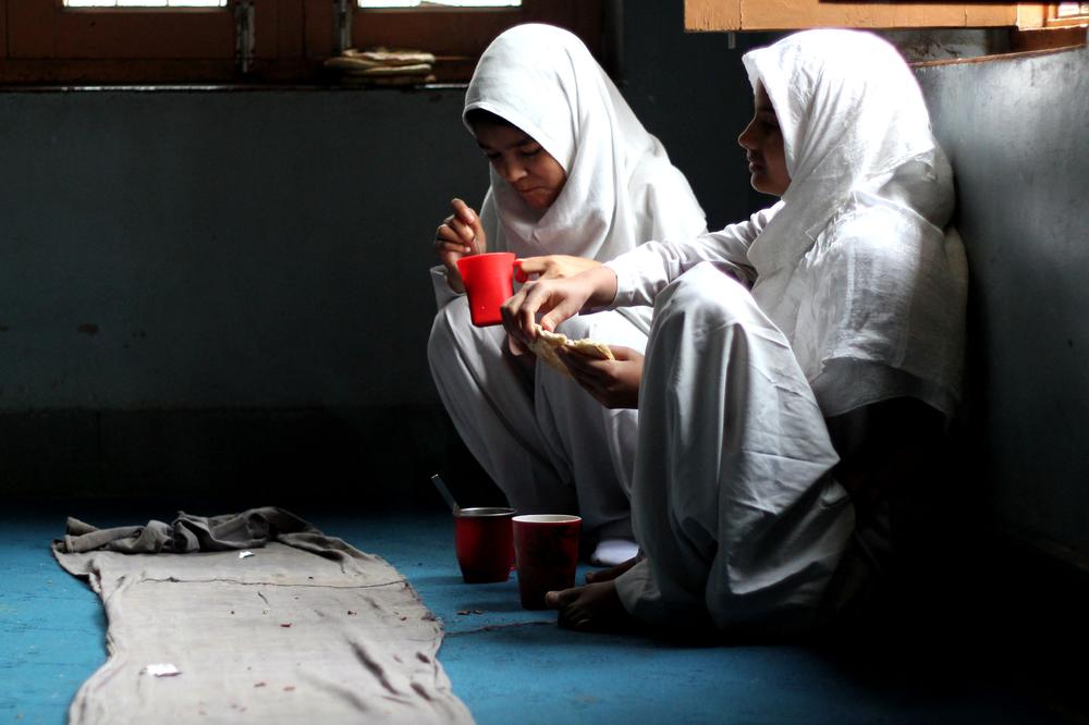 A group of girls wearing headscarves start their day with a breakfast of traditional bread and salted tea at an orphanage located on the outskirts of Srinagar, the capital of India-administered Kashmir.