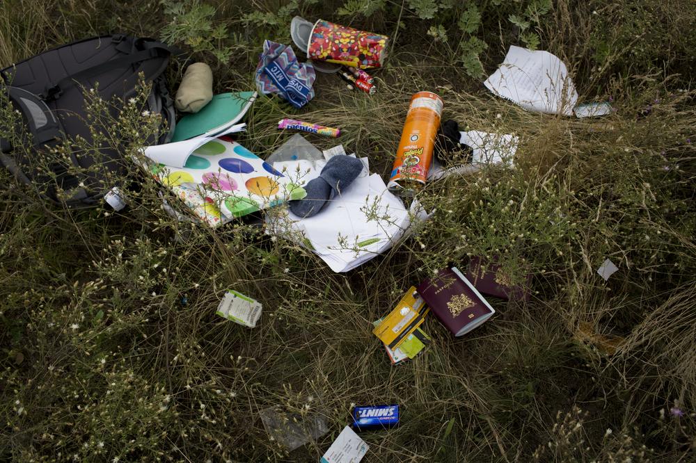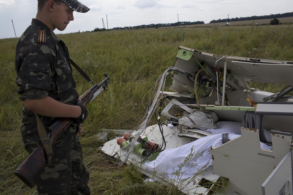 Pavel, a young rebel guarding the MH17 crash site, examines the plane wreckage. The rebels have been accused of downing the passenger plane, tampering with the crash site, and delaying the collection of the bodies of passengers. Heavy fighting is now raging around the crash site as the Ukrainian army fights for control of it.