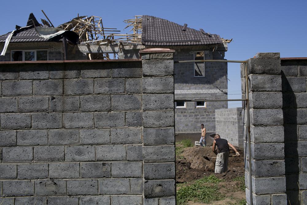 Labourers fill in a trench dug in the backyard of a house they had just finished building before the town was taken over by rebels earlier this year and the compound was turned into a fighting position. The roof lies in ruins after being hit by Ukrainian shells targeting the position.