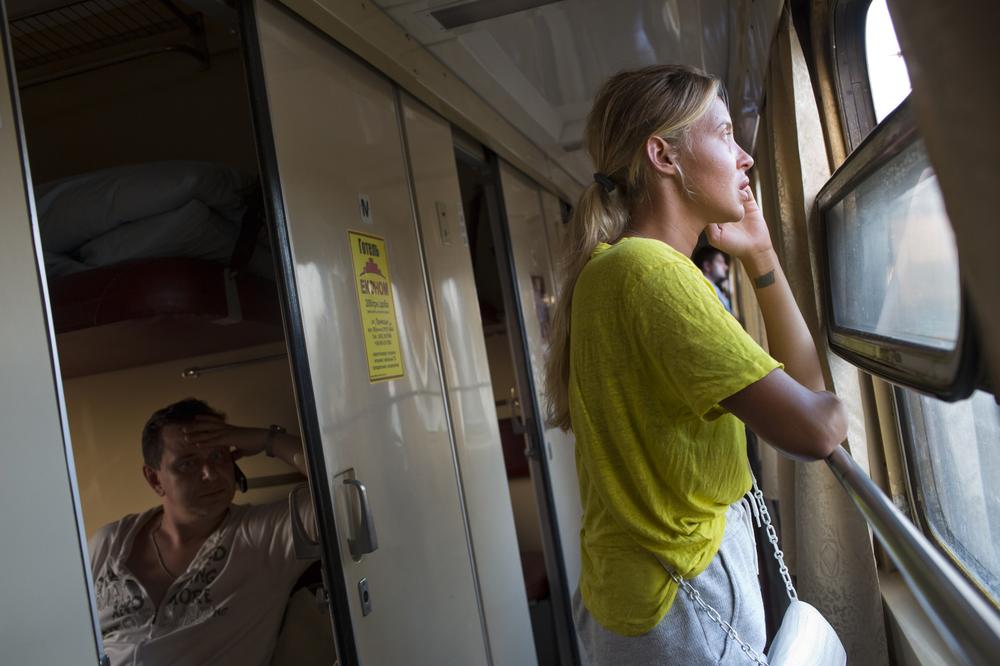 Passengers on the Kiev-Donetsk train speak on their phones to family members worried about their return to the embattled city of Donetsk amid renewed fighting for the city.