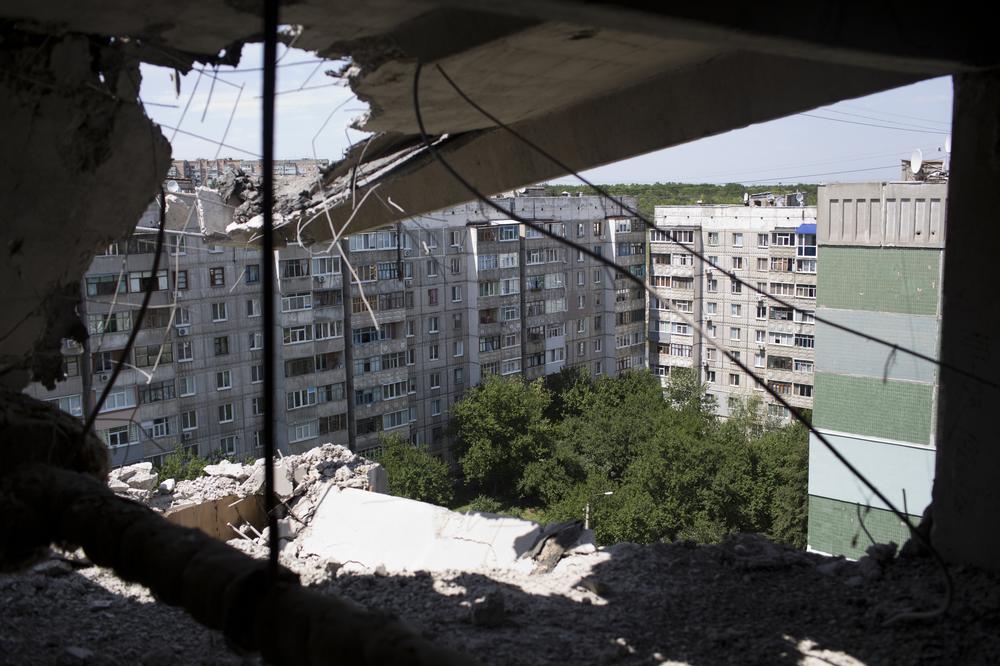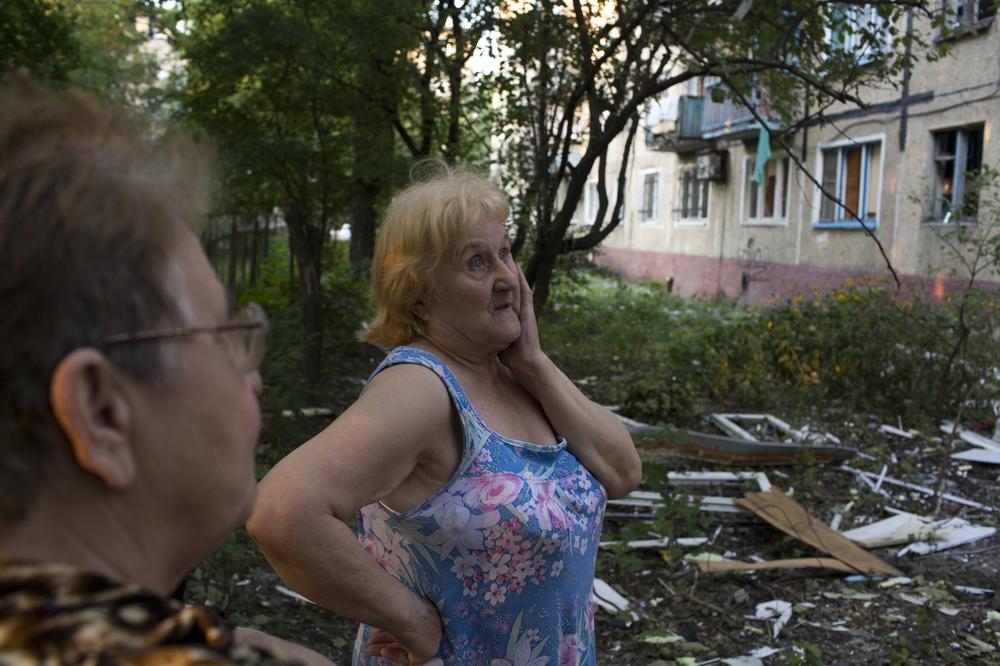 Women from a suburb of Donetsk take in the damage to an apartment building after the Ukrainian army began shelling in the area near the train station. They say there were no rebel fighters in the area.