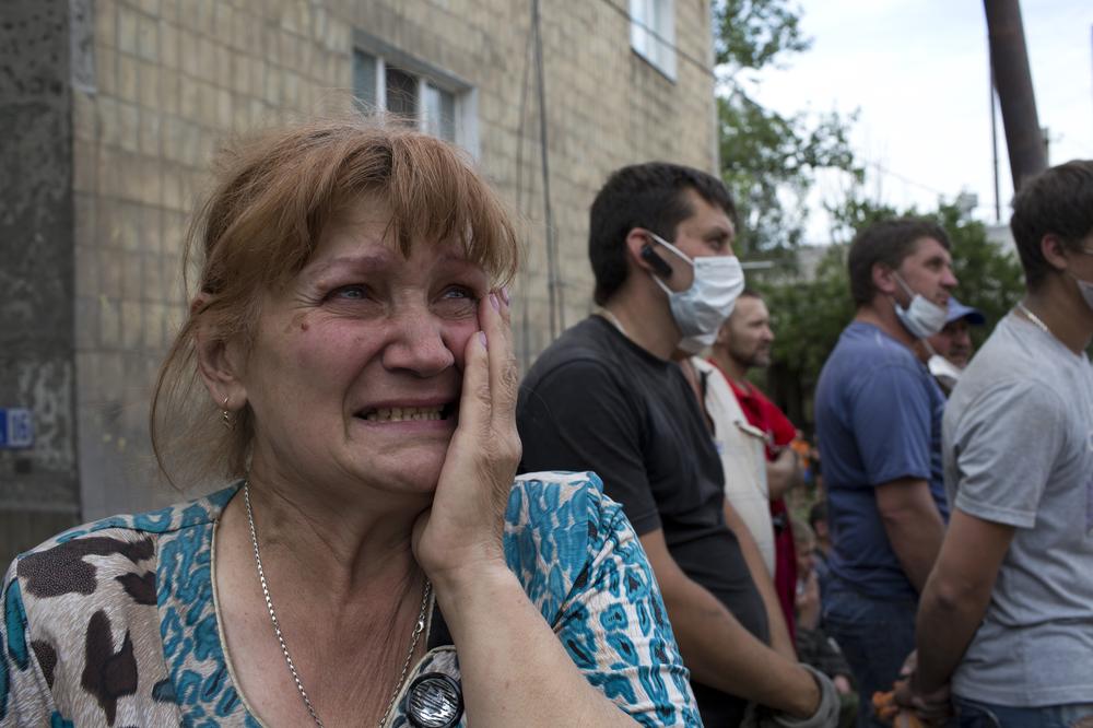 Svetlana Kontratuk, a retired nurse, is emotionally distraught after her flat took the brunt of the air strike, a bombing run that was supposed to have targeted a rebel headquarters some 300 metres down the road in Snizhne.