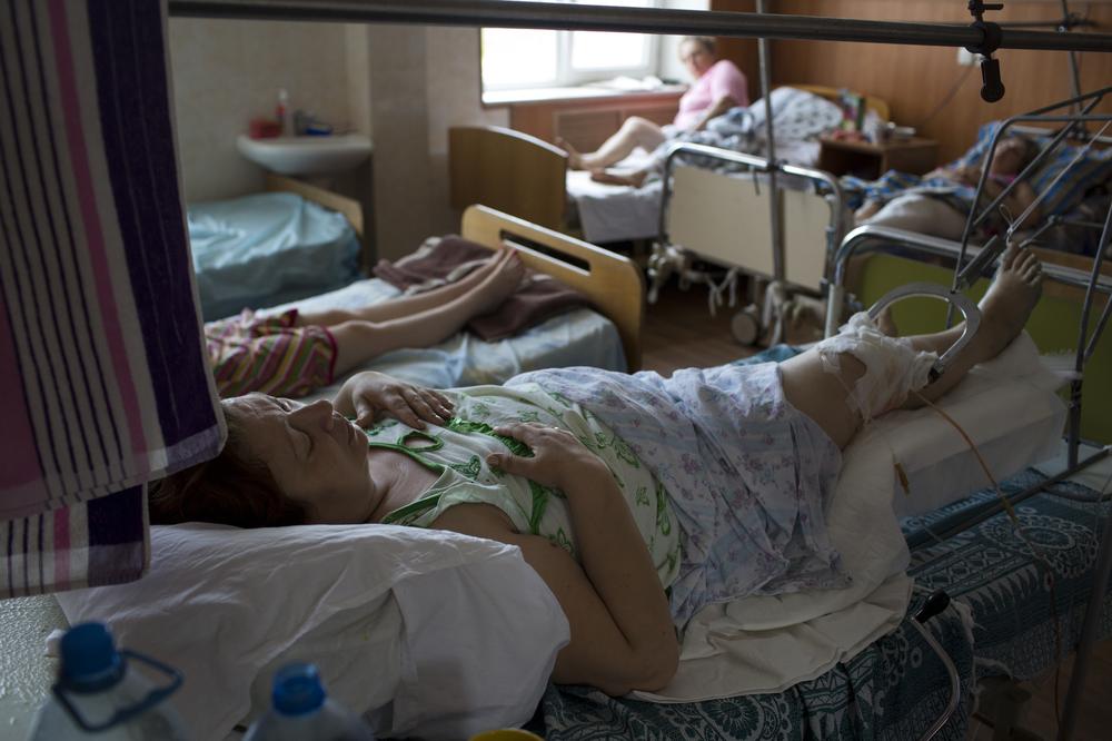 A woman recovers from her wounds after a Ukrainian army artillery strike hit her house in Lugansk. The UN said on Monday that 799 civilians have been killed in the conflict since mid-April and at least 2,155 have been wounded.