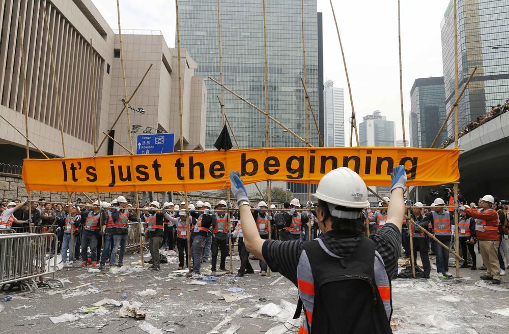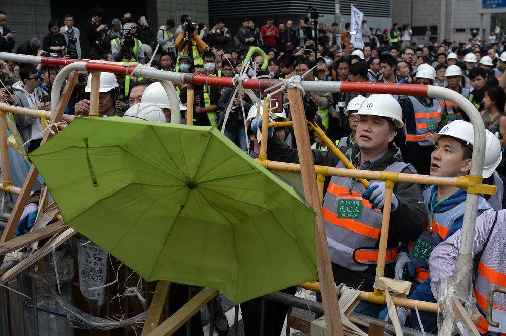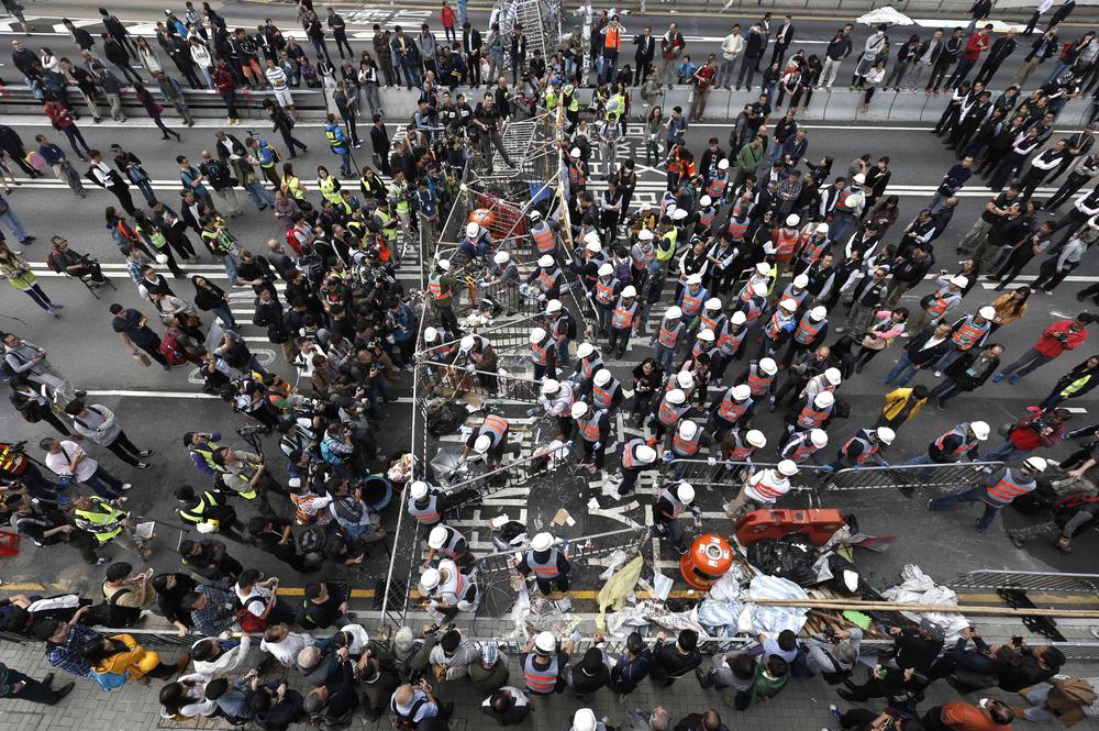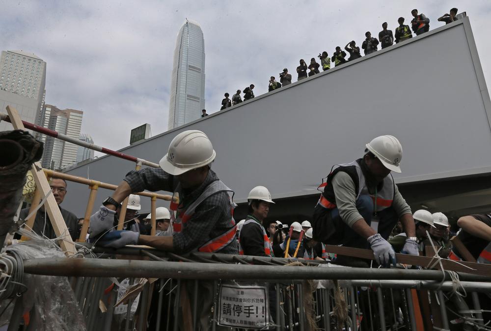 The workers removing the barricades were carrying out a court restraining order calling for barriers to be dismantled and obstructions removed from three sections of the protest site.